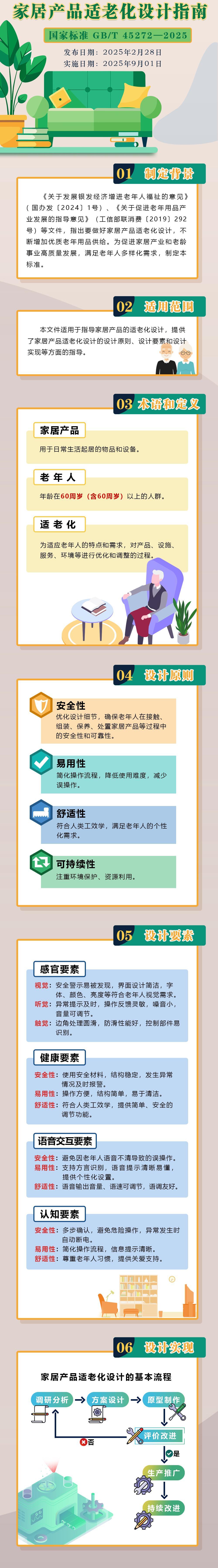 记者今天了解到,市场监管总局(国家标准委)近日批准发布《家居产品适老化设计指南》国家标准,将于2025年9月1日正式实施。