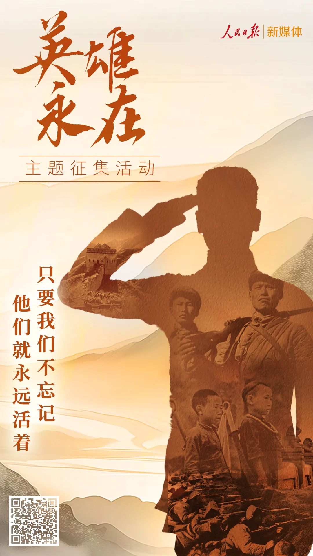 1.扫描图中二维码,或点击海报进入人民日报客户端“英雄永在”征集活动页面,点击“立即参与”上传有关抗日英雄记忆的相关文字、图片、视频。