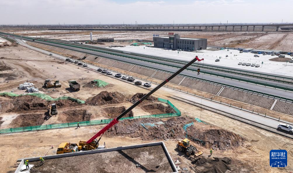 这是乌玛高速惠农至石嘴山段高庙湖服务区施工现场(4月10日摄,无人机照片)。新华社记者 冯开华 摄