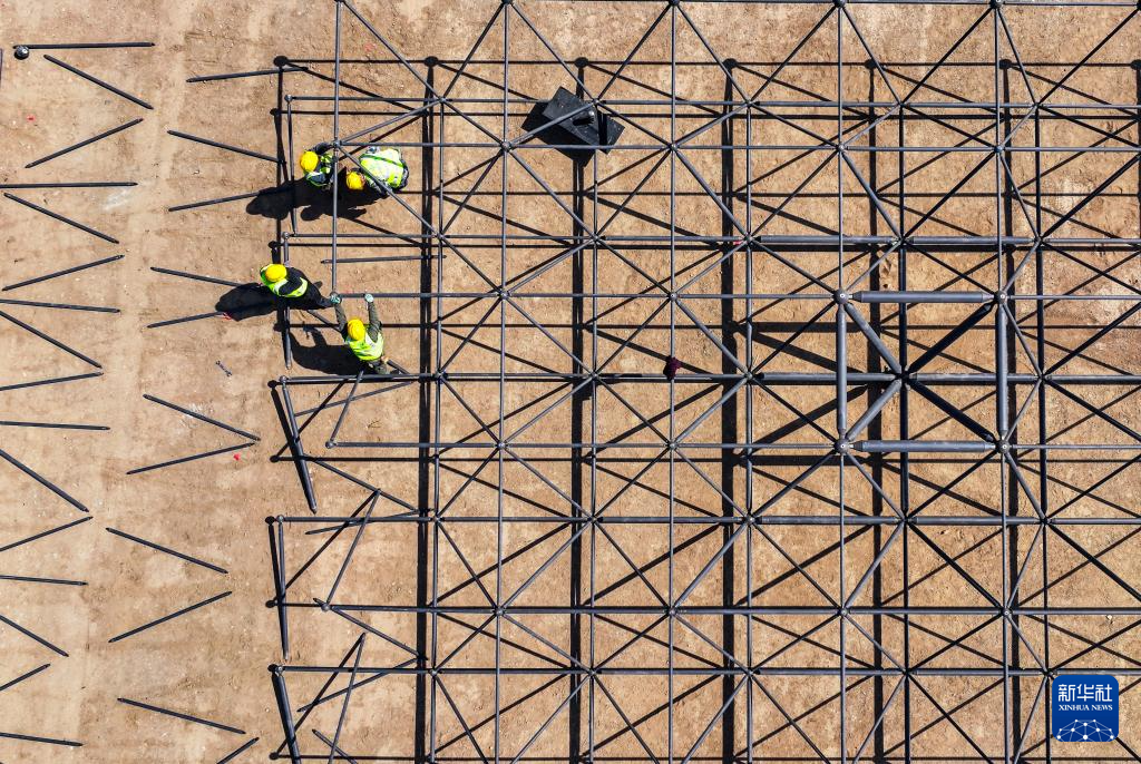 4月10日,工人在乌玛高速惠农至石嘴山段施工现场安装收费站顶棚(无人机照片)。新华社记者 冯开华 摄