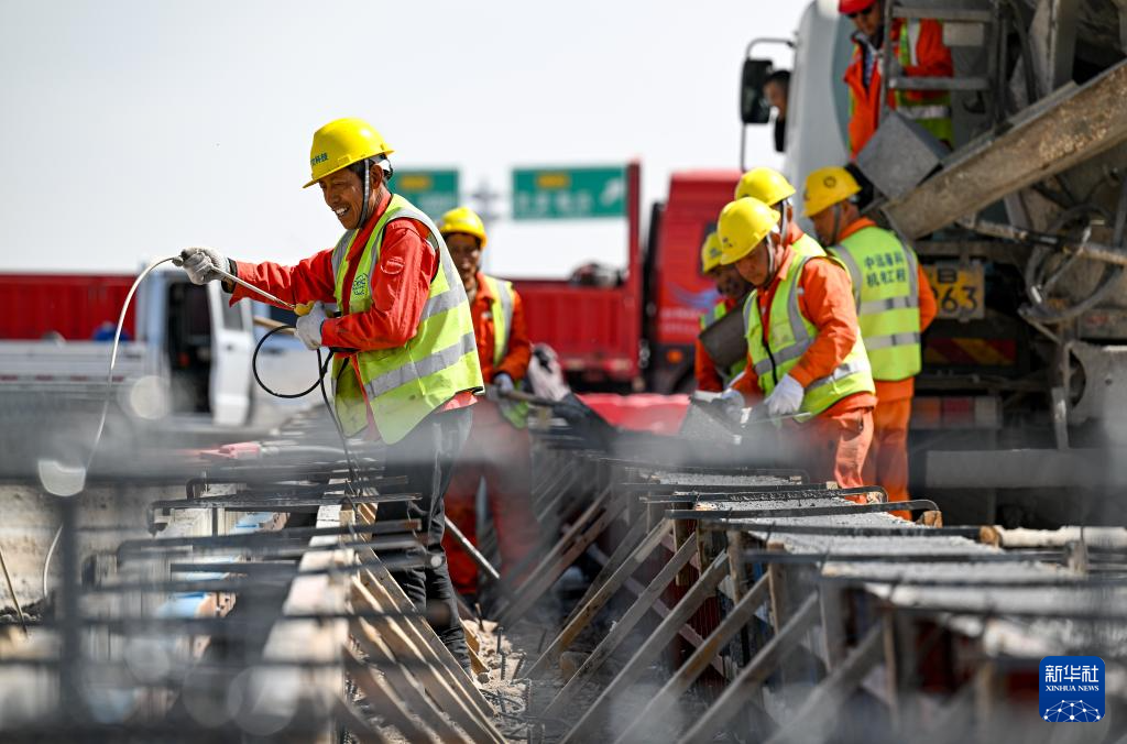 4月10日,工人在乌玛高速惠农至石嘴山段建设收费站。新华社记者 冯开华 摄