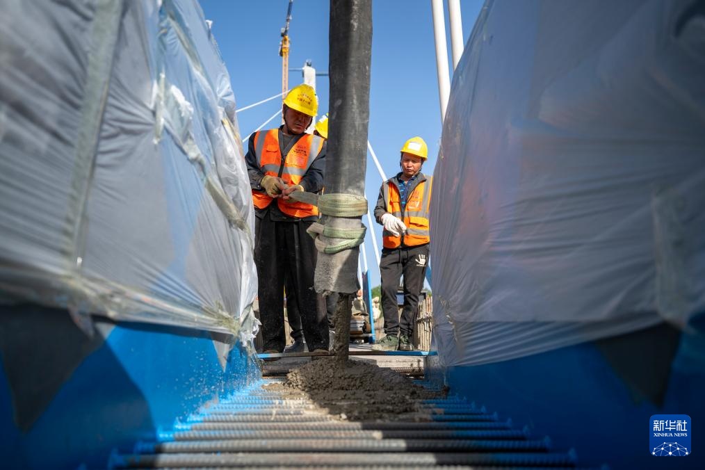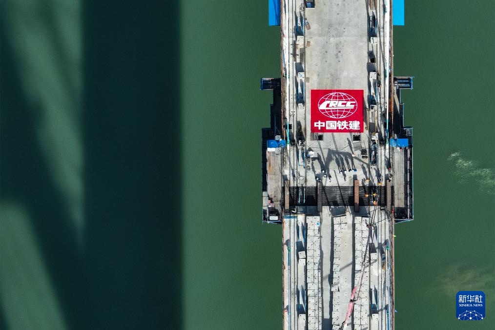 4月14日拍摄的汉江特大桥合龙施工现场(无人机照片)。新华社记者 伍志尊 摄