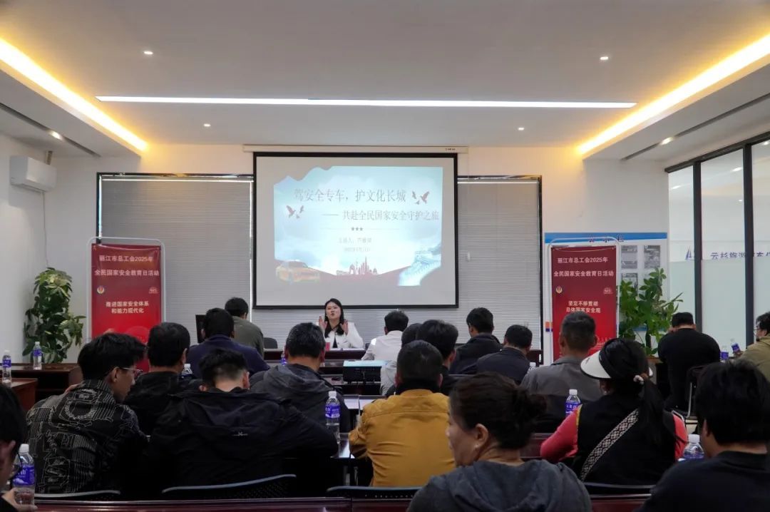 4月11日,在丽江云杉旅游汽车公司,丽江市总工会邀请了丽江文化旅游学院融媒体中心主任芦雅琪,对旅游大巴、网约车司机进行国家安全宣讲。