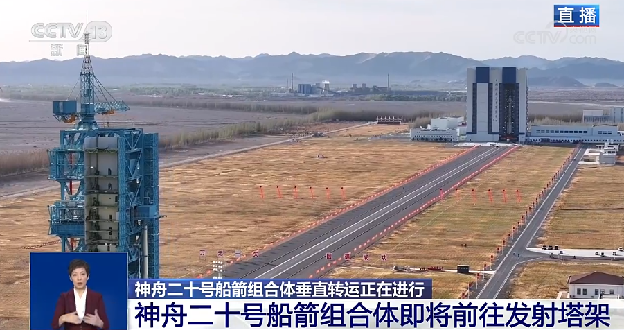 今天(16日),在酒泉卫星发射中心,执行神舟二十号载人飞行任务的长征二号F遥二十火箭船箭组合体驶出总装测试厂房,正在垂直转运至发射区。