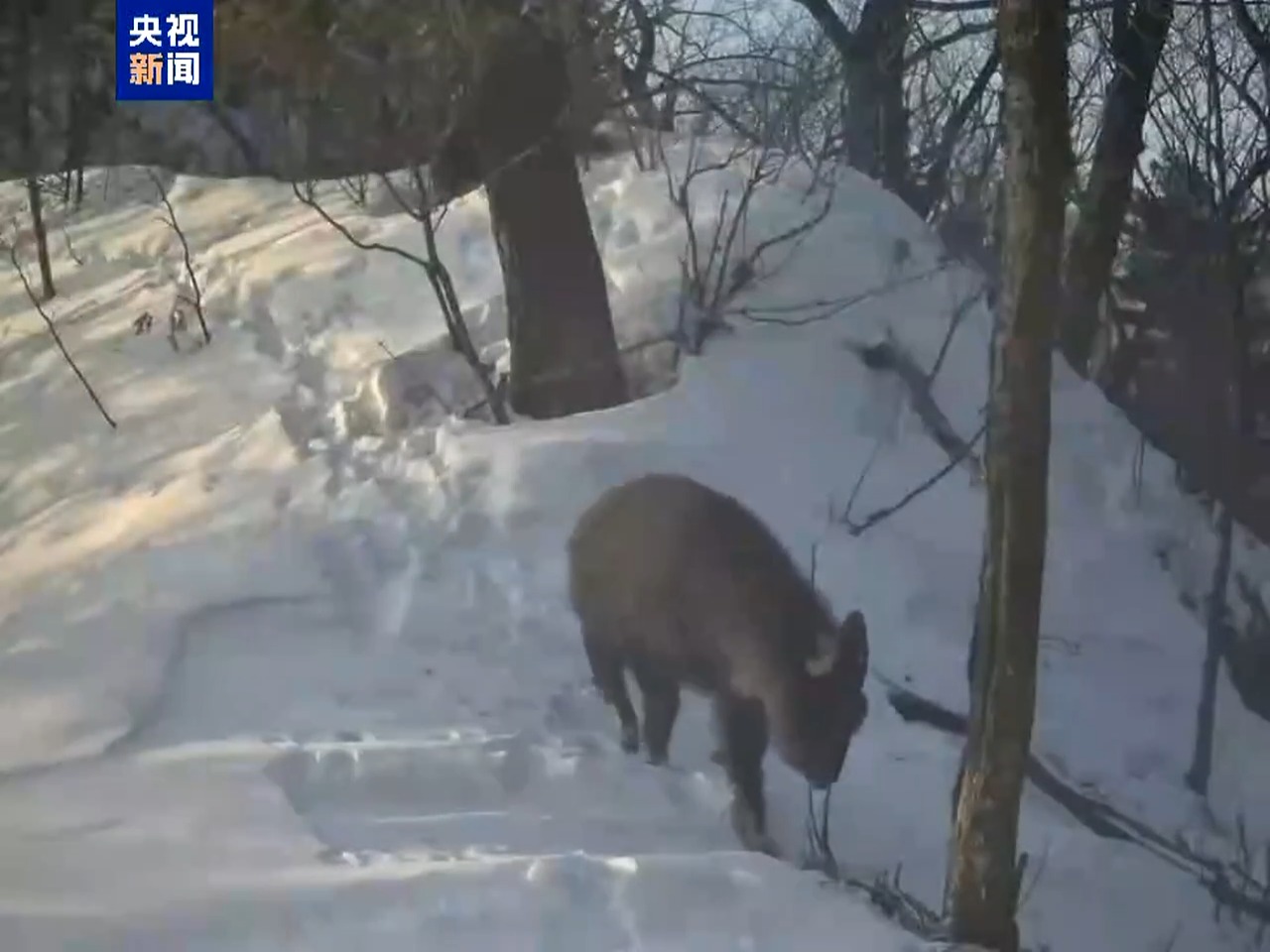 据黑龙江省野生动物研究所钟立成团队介绍,在冰雪覆盖的山脊上,一只长尾斑羚踏雪悠然自得地四处觅食,体态饱满,呆萌可爱。这是一只成年长尾斑羚,仅分布在我国东北地区,是一种偶蹄目牛科斑羚属高山动物,别名青羊。长尾斑羚是国家二级重点保护野生动物,这次拍摄是近15年来哈尔滨地区首次捕捉到的野生斑羚实体影像。长尾斑羚外形似家养的山羊,身体粗壮,四肢粗短,体长95厘米~130厘米,体毛一般为棕褐色,整个身体的底绒均为灰色。为典型的林栖兽类,常在密林间的陡峭崖坡出没,喜欢开阔多草的山脊环境,特别善于跳跃、攀登,在悬崖绝壁和深山幽谷之间奔走如履平川,视觉、听觉极为灵敏,叫声似羊。