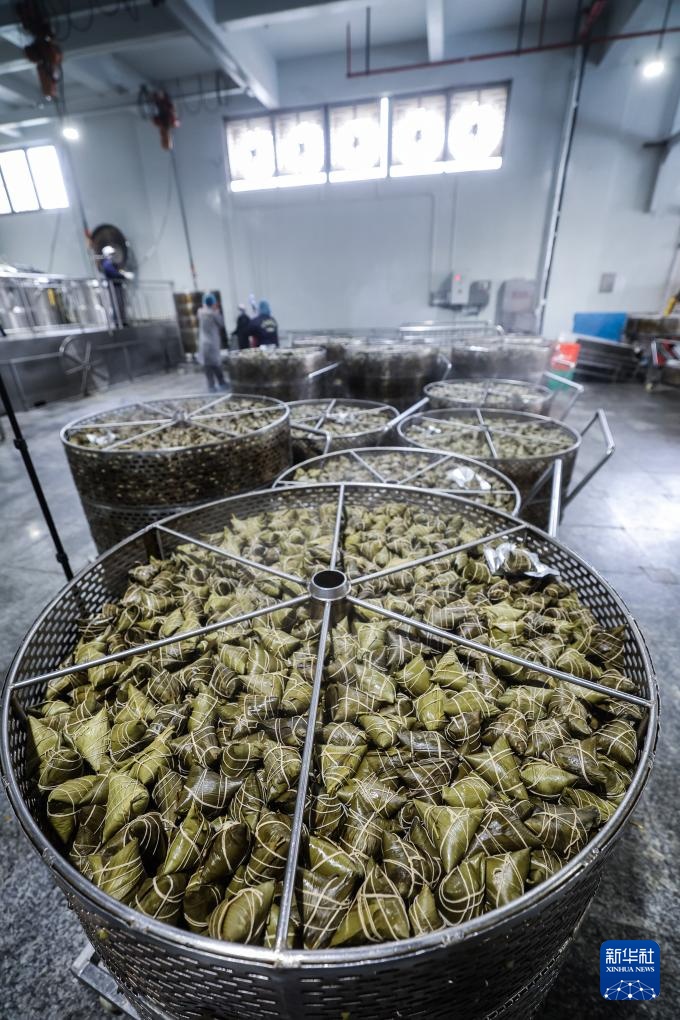4月16日,在位于嘉兴南湖区湘家荡农业加工园的老字号企业南湖斋食品股份有限公司煮粽车间内,工人操作数字化煮粽系统煮粽子,每个大锅一次可以煮约5000个粽子。新华社记者 徐昱 摄