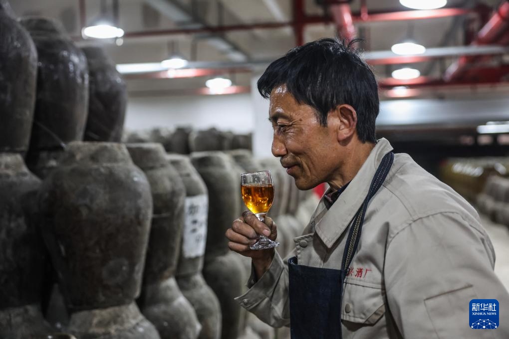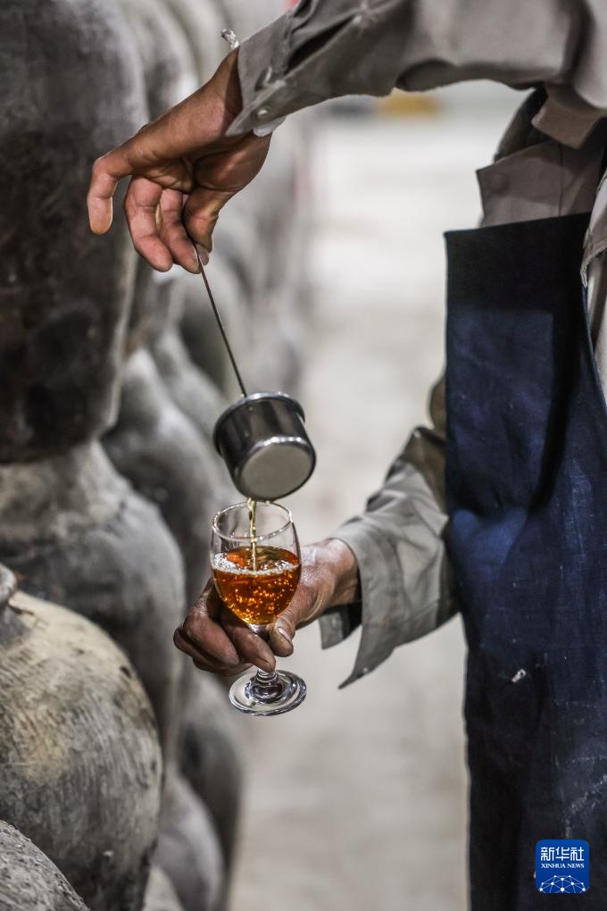 4月16日,在嘉兴南湖区湘家荡农业加工园的老字号企业嘉兴酒厂的地下酒库内,工人在开坛检查年份黄酒的色香味。新华社记者 徐昱 摄