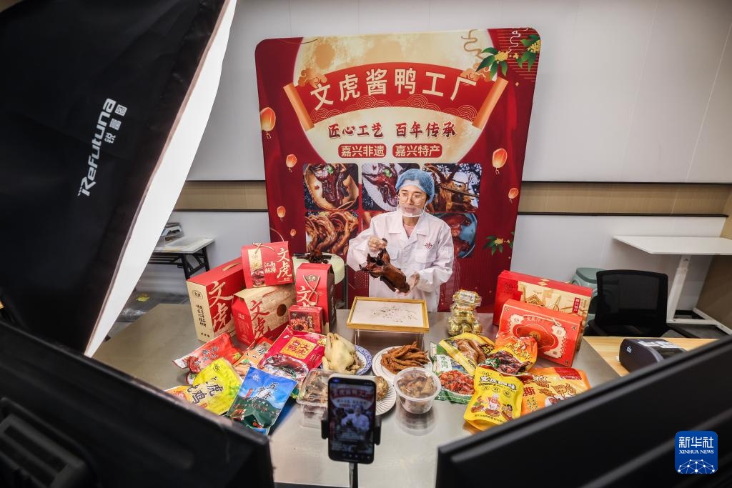 4月16日,在位于嘉兴南湖区湘家荡农业加工园的老字号企业嘉兴文虎酱鸭股份有限公司直播间内,工作人员在直播销售酱鸭。新华社记者 徐昱 摄
