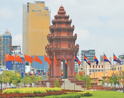 4月16日,在柬埔寨首都金边市中心的独立纪念碑前,中柬两国国旗迎风飘扬。人民日报记者 白元琪 摄
