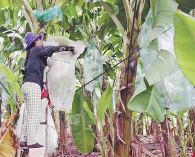 在柬埔寨磅湛省地泽香蕉园,蕉农正给香蕉果实套袋。人民日报记者 赵益普 摄