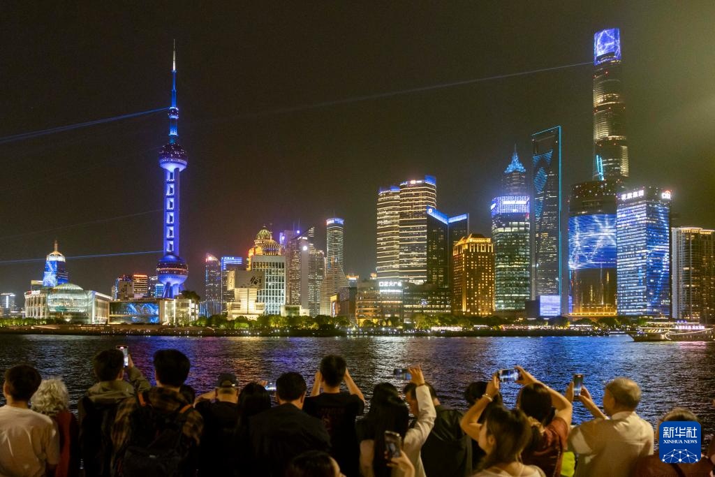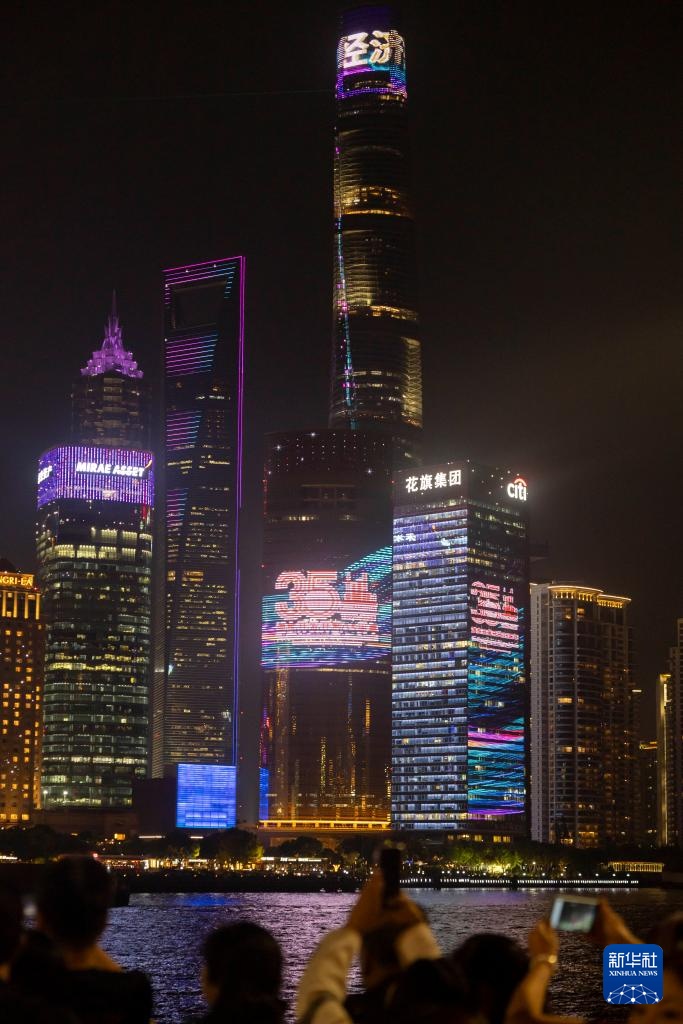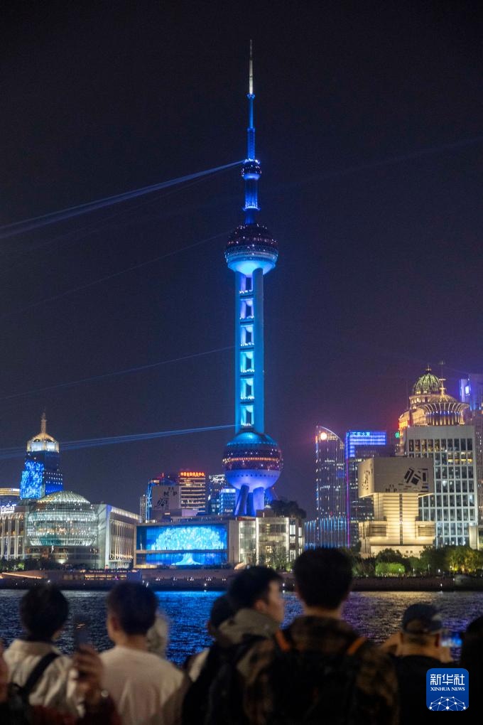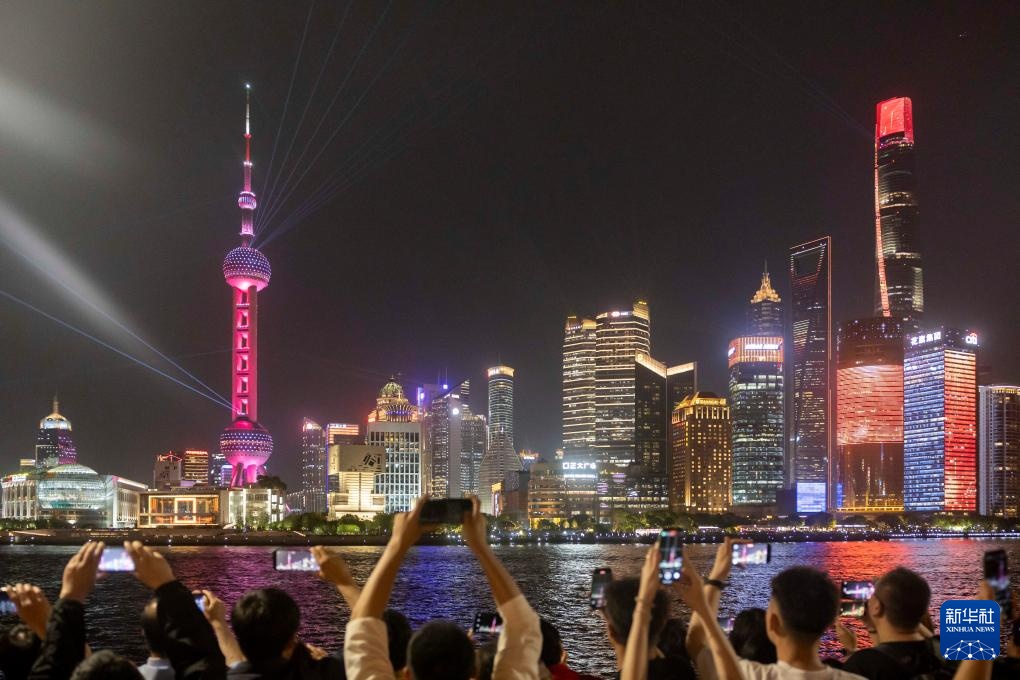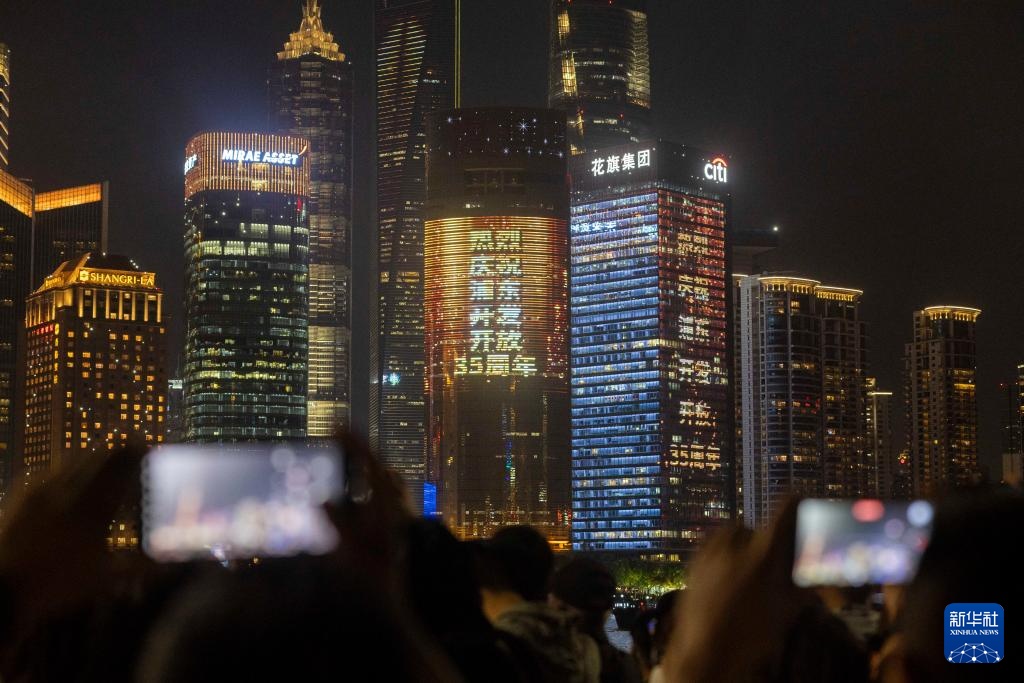 4月17日,人们在上海外滩拍摄对岸陆家嘴庆祝浦东开发开放35周年光影秀。新华社记者 王翔 摄