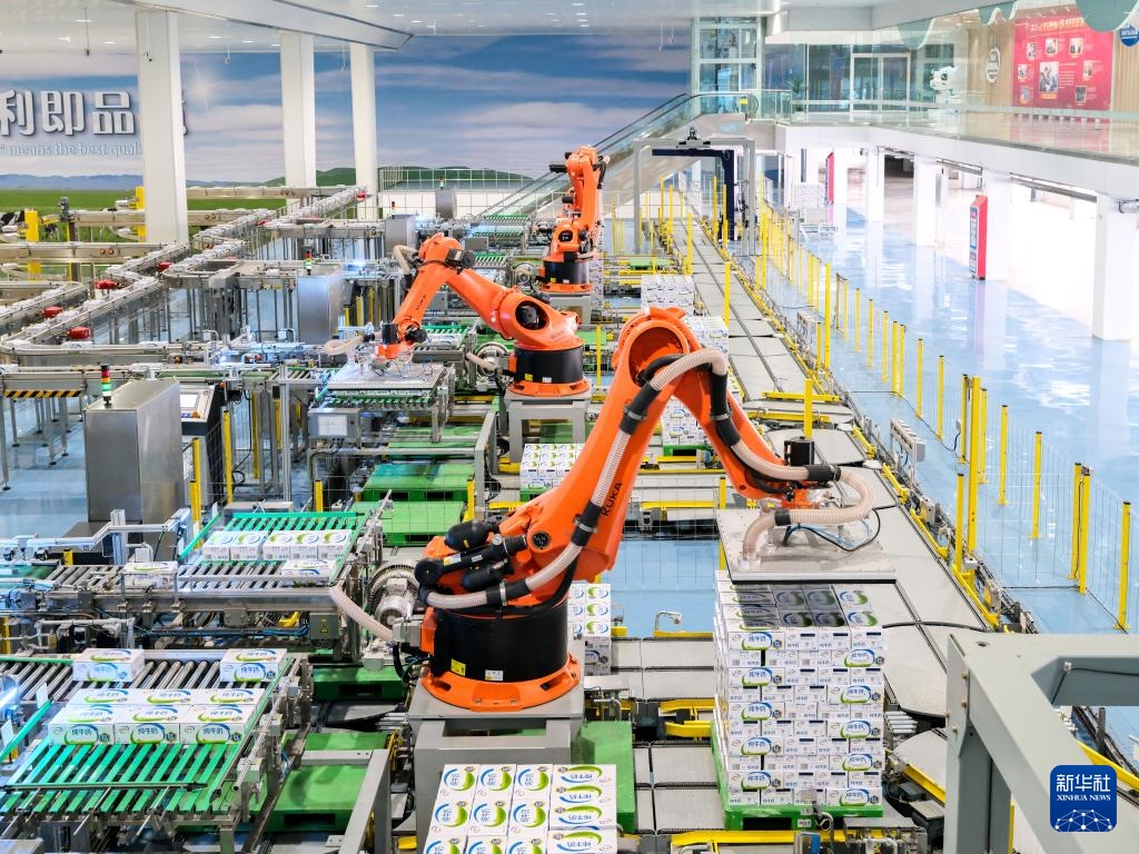4月17日,在呼和浩特市土默特左旗伊利现代智慧健康谷全球智能制造产业园内,机械臂进行包装作业。新华社记者 马金瑞 摄