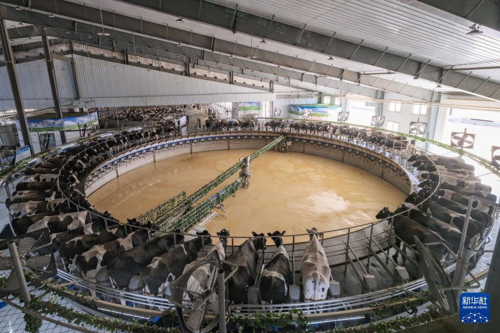 4月17日在呼和浩特市土默特左旗伊利敕勒川生态智慧牧场拍摄的挤奶中的奶牛。新华社记者 马金瑞 摄