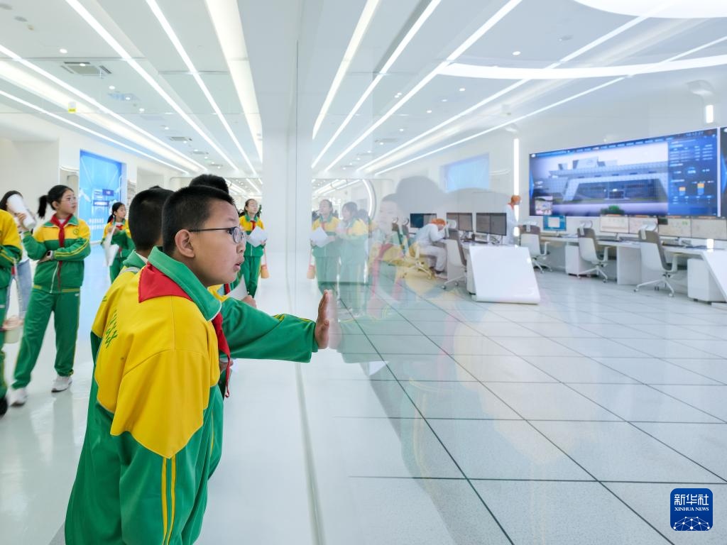 4月17日,在呼和浩特市土默特左旗,小朋友在伊利现代智慧健康谷全球智能制造产业园内参观。新华社记者 马金瑞 摄