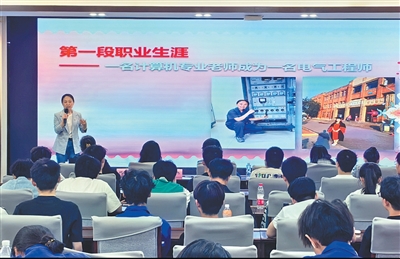 赵建利从自身求学之路讲起,分享了个人从计算机领域转入电网行业的经历。那些挑灯夜战的日子,无数次推倒重来的尝试,无一不让同学们深切感受到她对知识的渴望和对理想的执着。讲到电网数字化应用技术体系时,赵建利轻点鼠标,大屏幕上随即呈现出复杂而有序的电网架构与数据流转图。“人生不是预设的剧本,要敢于尝试、改变和体验。”她详细阐述电网数字化应用技术体系与典型应用场景,鼓励同学们胸怀远大,更要专注当下、努力学习知识本领,在中国式现代化征程中实现自己的人生价值。