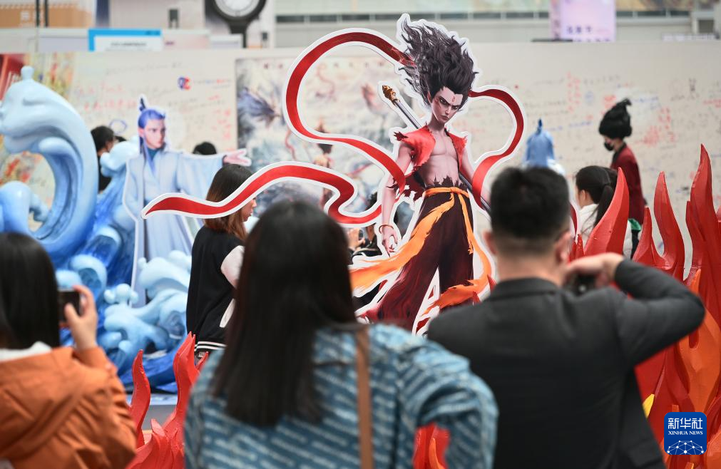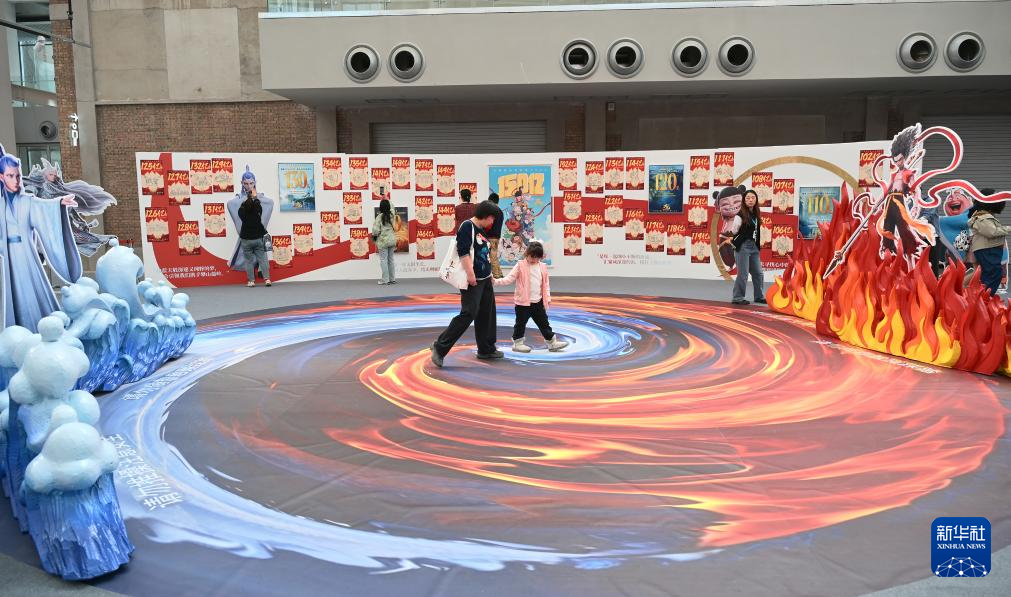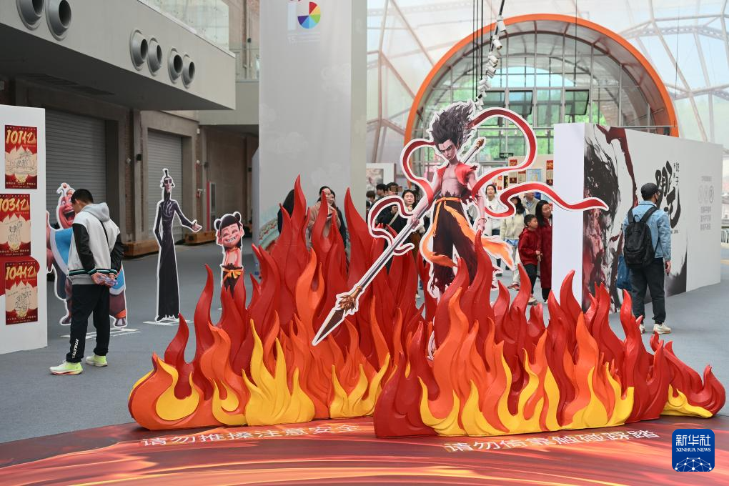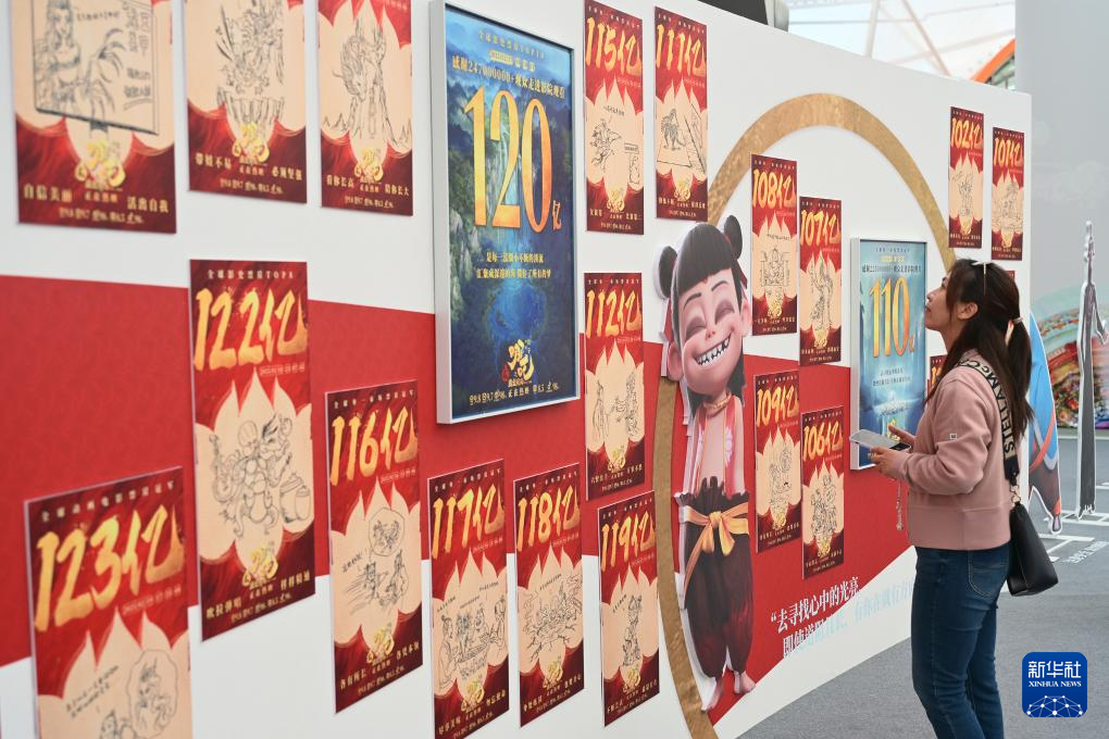 4月19日,观众从电影《哪吒之魔童闹海》破亿手绘海报展展示的电影衍生文创产品前走过。新华社记者 李鑫 摄