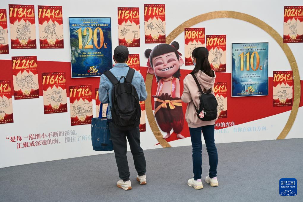 4月19日,观众在电影《哪吒之魔童闹海》破亿手绘海报展上参观拍照。新华社记者 李鑫 摄