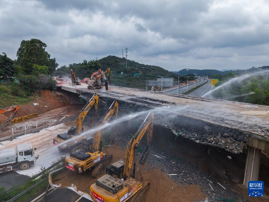 施工队伍在拆除常虎高速旧高架桥(无人机照片,4月19日摄)。新华社记者 刘大伟 摄