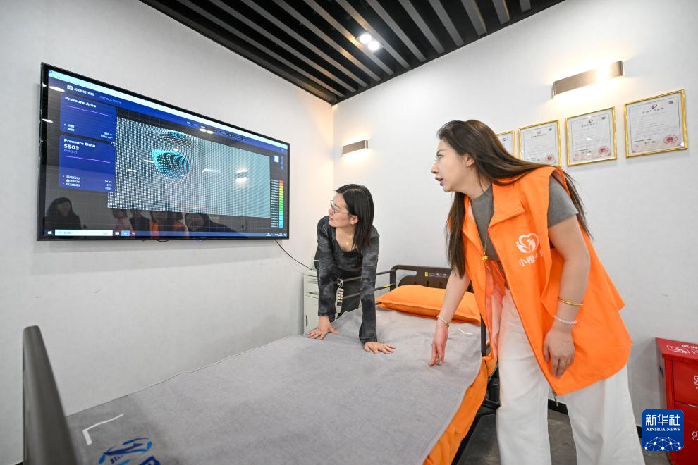 在天津小橙集团有限公司,工作人员展示一款安装有传感器的纤维床垫(4月18日摄)。该床垫可通过终端设备直观查看床垫受力压力数值,被应用于居家养老等服务场景。新华社记者 孙凡越 摄