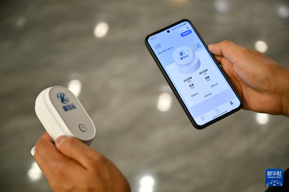 在天津小橙集团有限公司,工作人员展示一款联网可查看的毫米波体征监测仪(4月18日摄)。新华社记者 孙凡越 摄