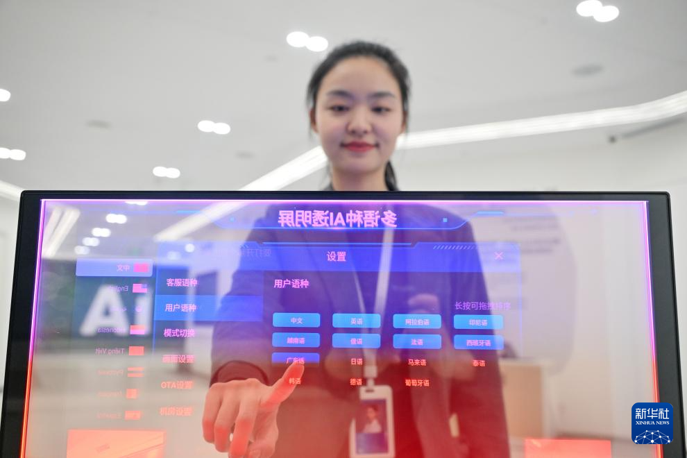 在科大讯飞天津公司,工作人员演示多语种AI透明屏实时翻译系统(4月18日摄)。新华社记者 孙凡越 摄
