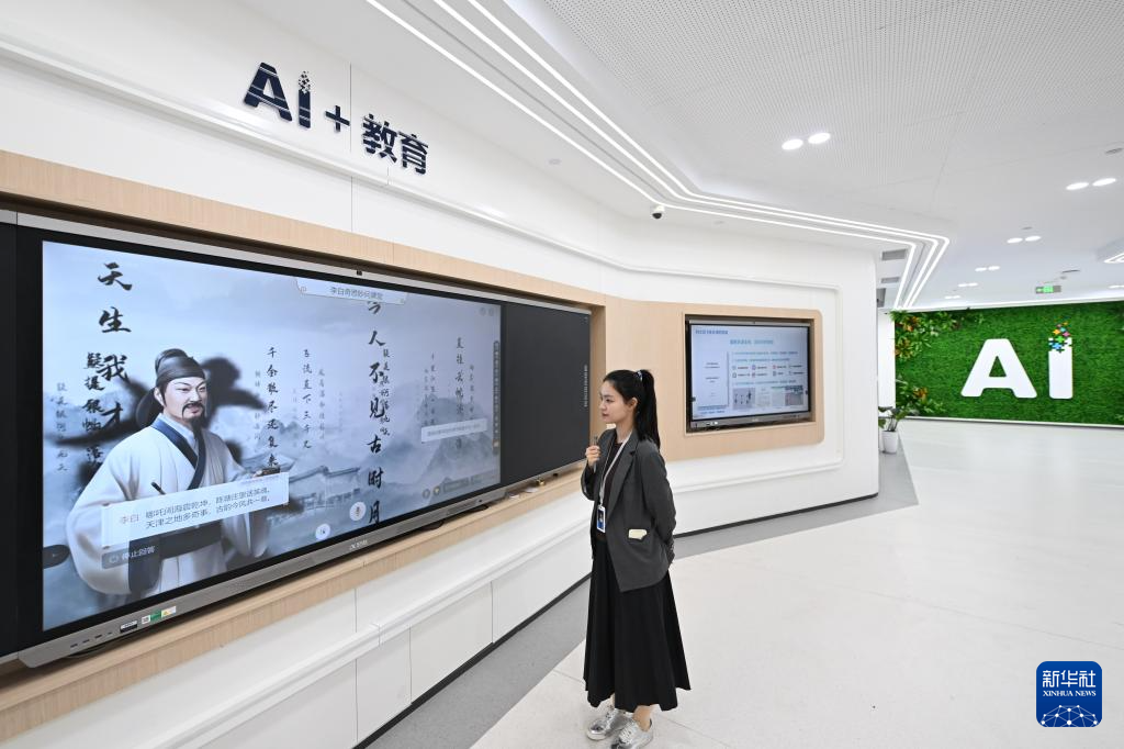 在科大讯飞天津公司,工作人员展示用于教育领域的AI产品(4月18日摄)。新华社记者 孙凡越 摄
