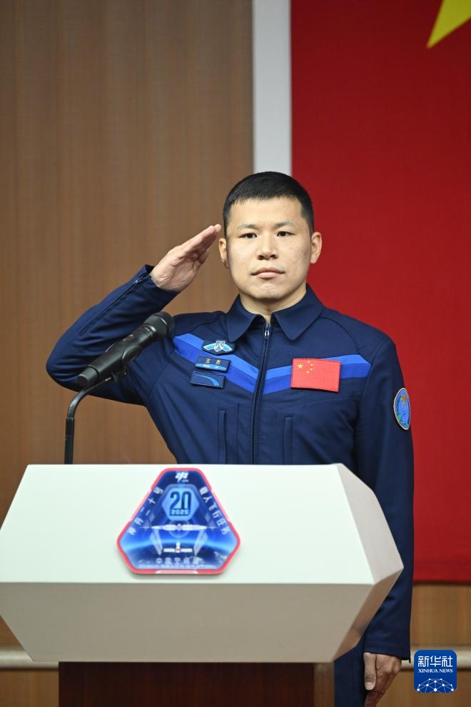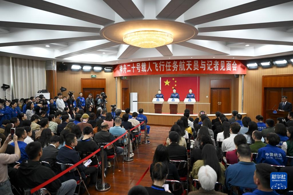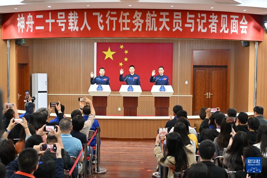 4月23日,神舟二十号载人飞行任务航天员陈冬、陈中瑞、王杰在酒泉卫星发射中心问天阁与媒体记者集体见面。这是航天员王杰与媒体记者见面。新华社记者 连振 摄