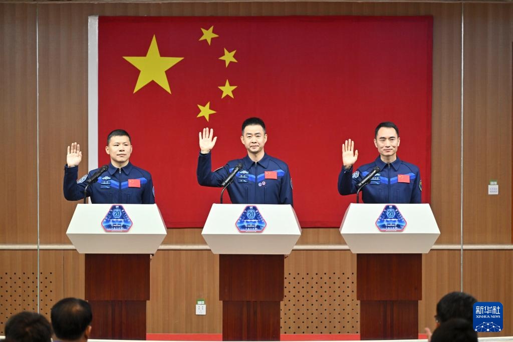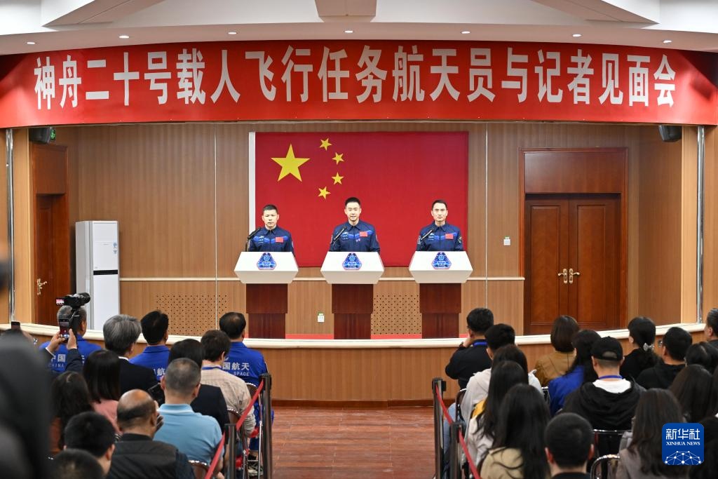 4月23日,神舟二十号载人飞行任务航天员陈冬(中)、陈中瑞(右)、王杰在酒泉卫星发射中心问天阁与媒体记者集体见面。新华社记者 连振 摄