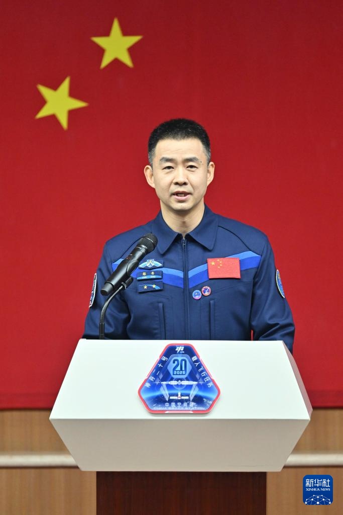 4月23日,神舟二十号载人飞行任务航天员陈冬、陈中瑞、王杰在酒泉卫星发射中心问天阁与媒体记者集体见面。这是航天员陈中瑞与媒体记者见面。新华社记者 连振 摄