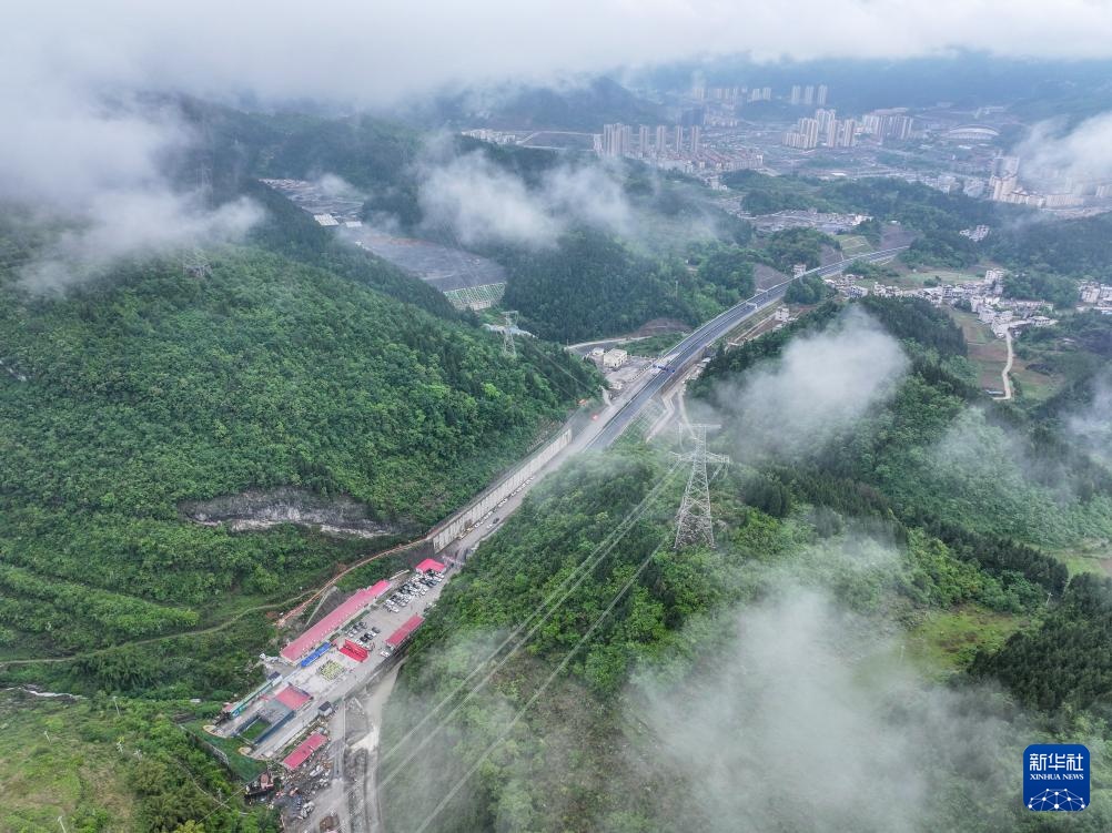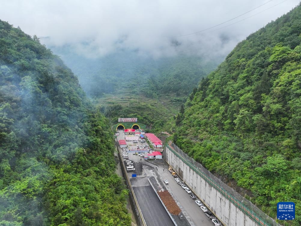 这是4月24日拍摄的渝湘复线高速公路彭水隧道贯通仪式现场(无人机照片)。新华社记者 唐奕 摄