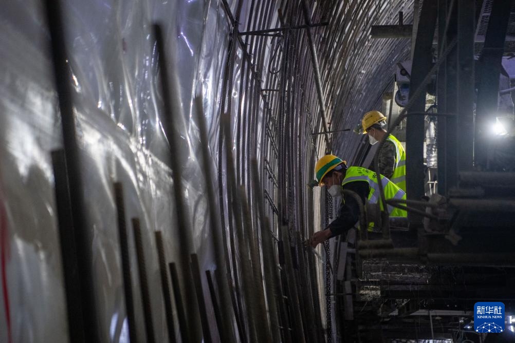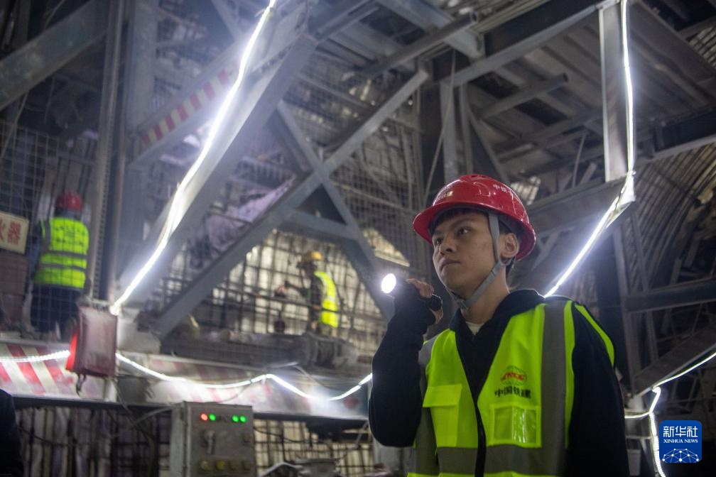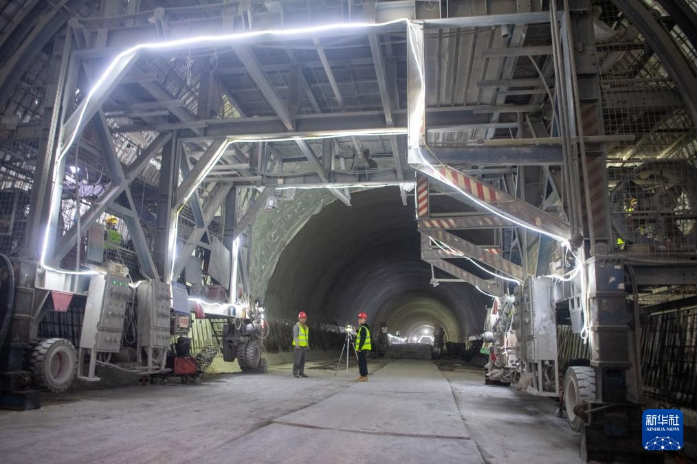 4月24日,工作人员在渝湘复线高速公路彭水隧道进行隧道贯通后的收尾工作。新华社记者 唐奕 摄