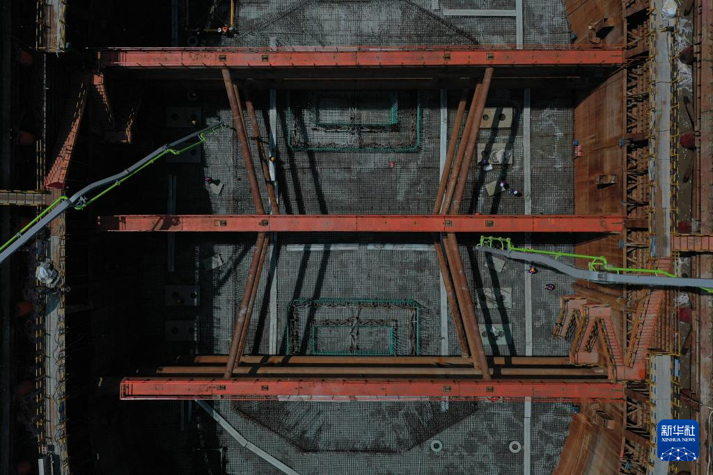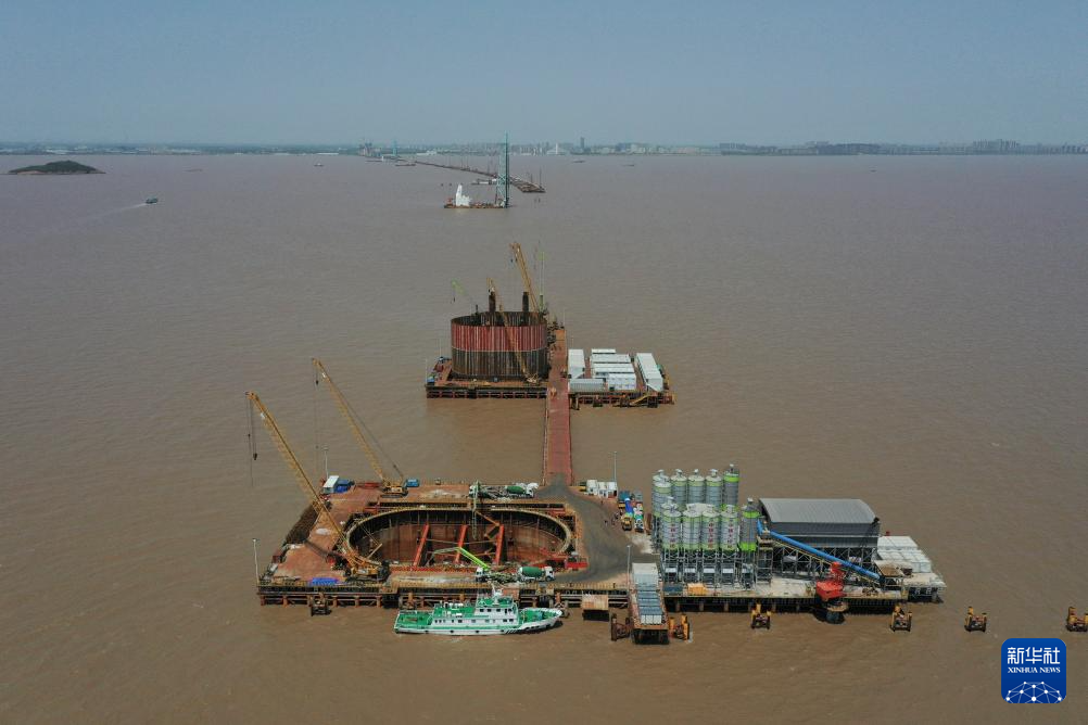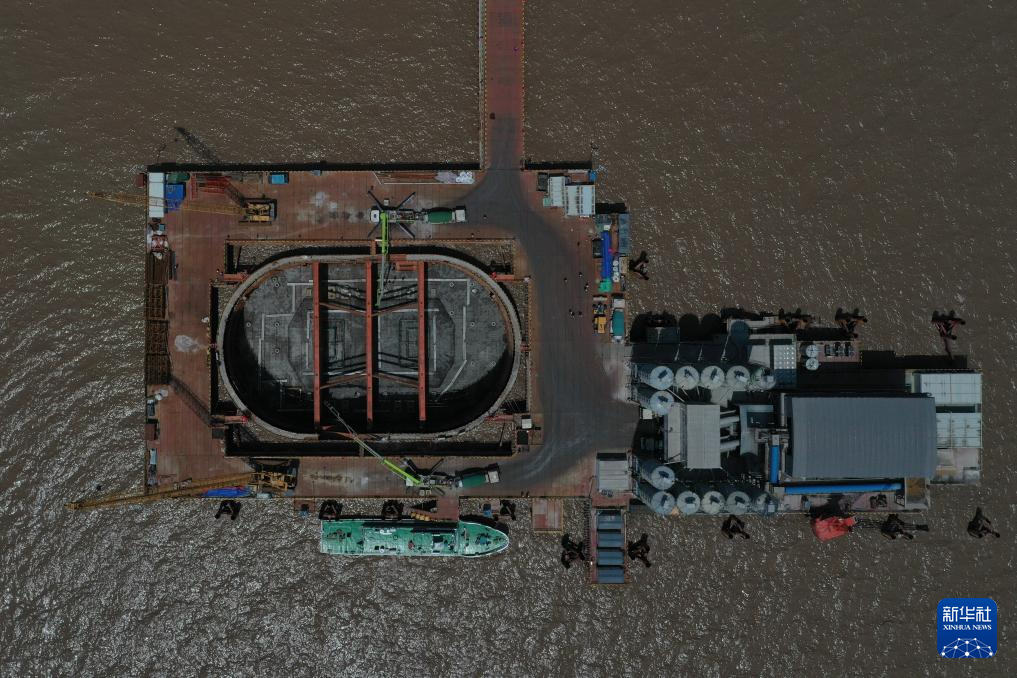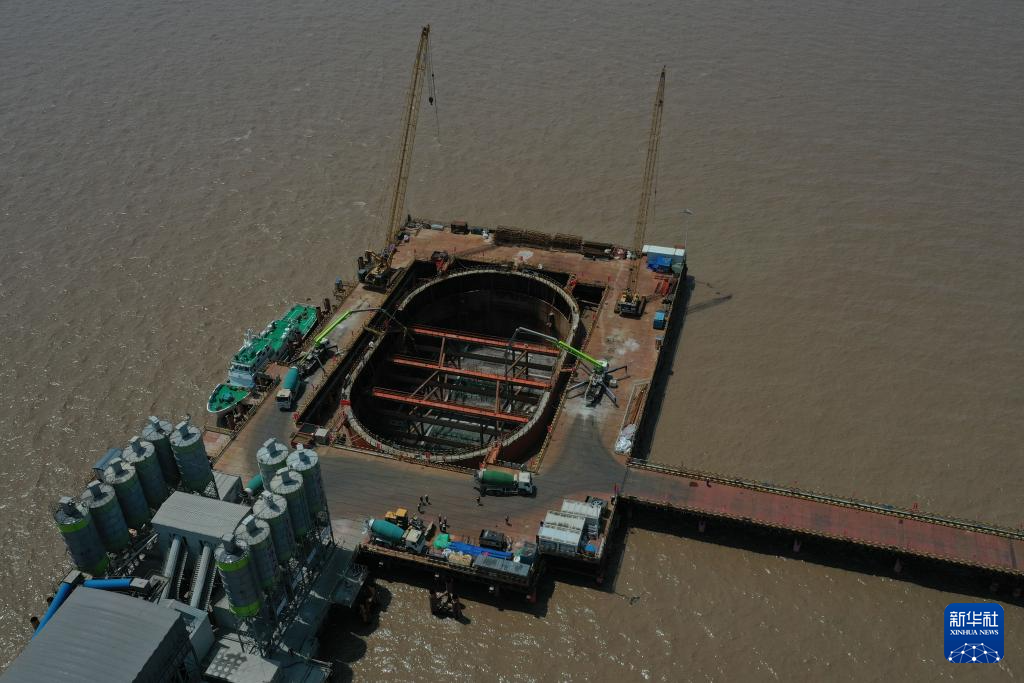 4月25日,中铁大桥局施工人员在杭州湾跨海铁路桥中航道桥81号主塔墩进行承台浇筑作业(无人机照片)。新华社记者 黄宗治 摄