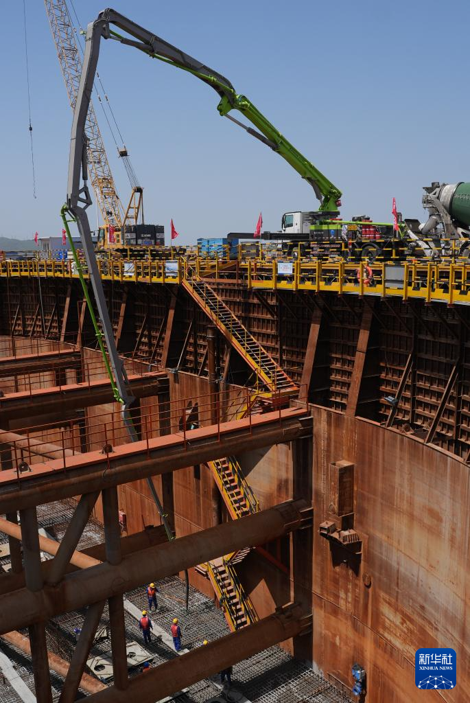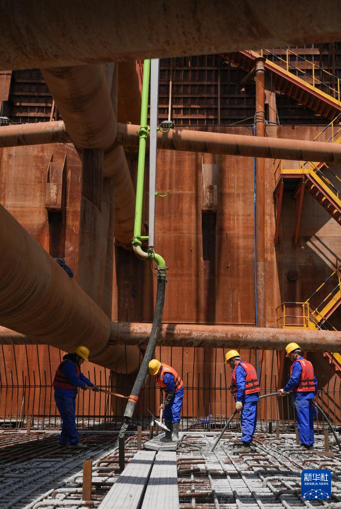 4月25日,中铁大桥局施工人员在杭州湾跨海铁路桥中航道桥81号主塔墩进行承台浇筑作业。新华社记者 黄宗治 摄