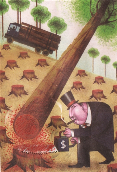 瞧,这家伙在金钱的驱动下“玩命”地采伐树木,片片山林顿时变成荒漠……这等贪婪的掠夺给环境带来的灾难真是罄竹难书!