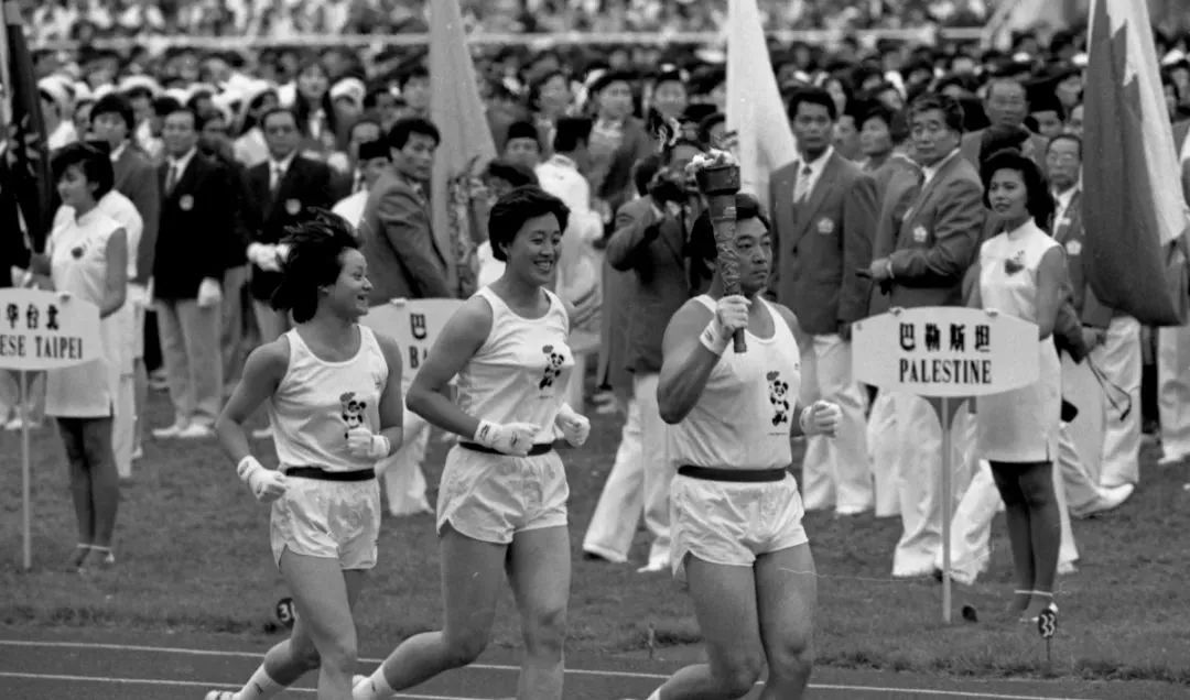 1990年9月22日,北京工人体育场,第十一届亚运会开幕式,火炬手许海峰、张蓉芳、高敏(前排从右至左)跑入会场。