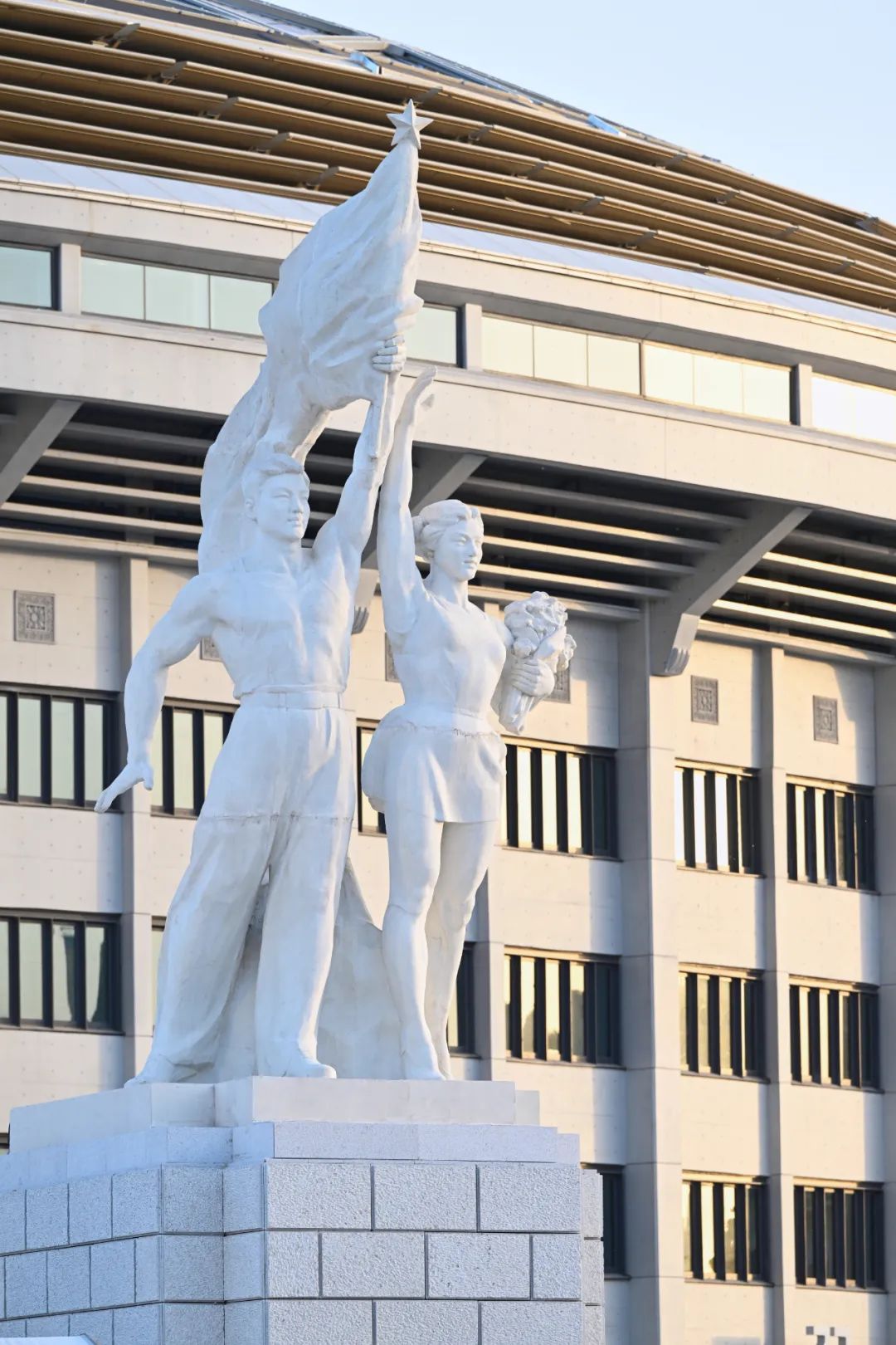 从北门走进“新工体”的广场,第一眼看到的,就是北广场正中央1959年落成的男女工人“迎宾”雕塑。