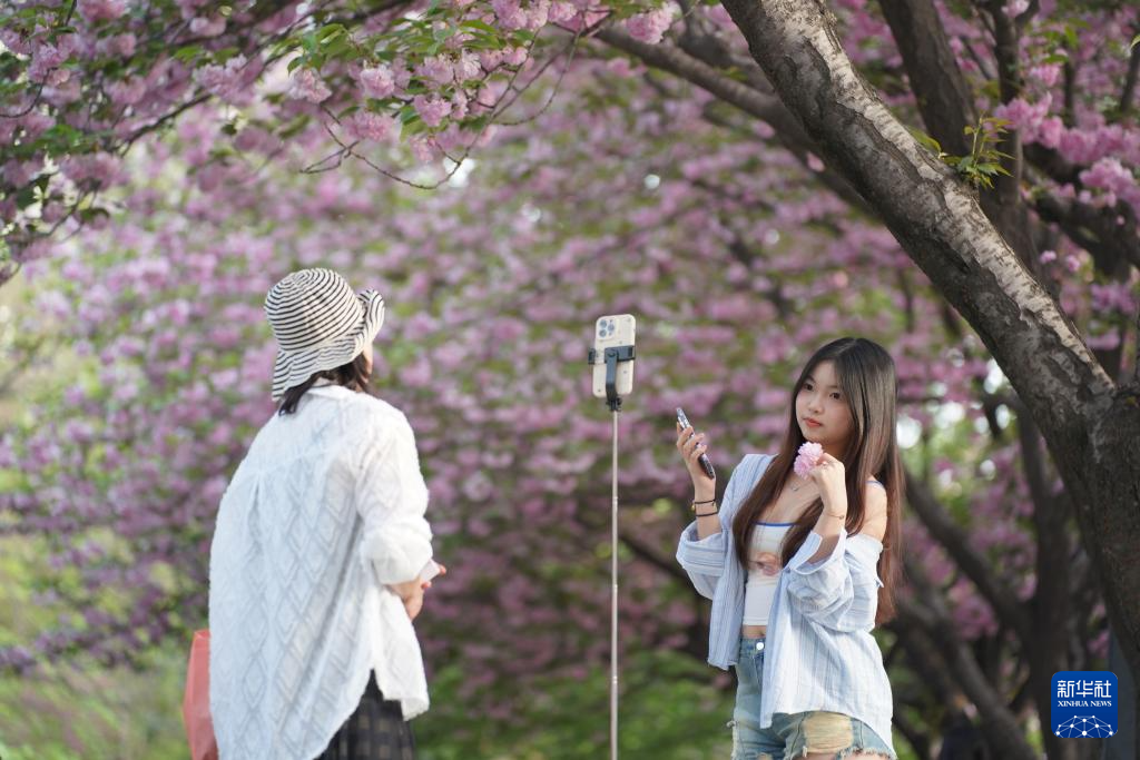 4月8日,游人在西安曲江池西路樱花树下拍照。新华社记者 邵瑞 摄