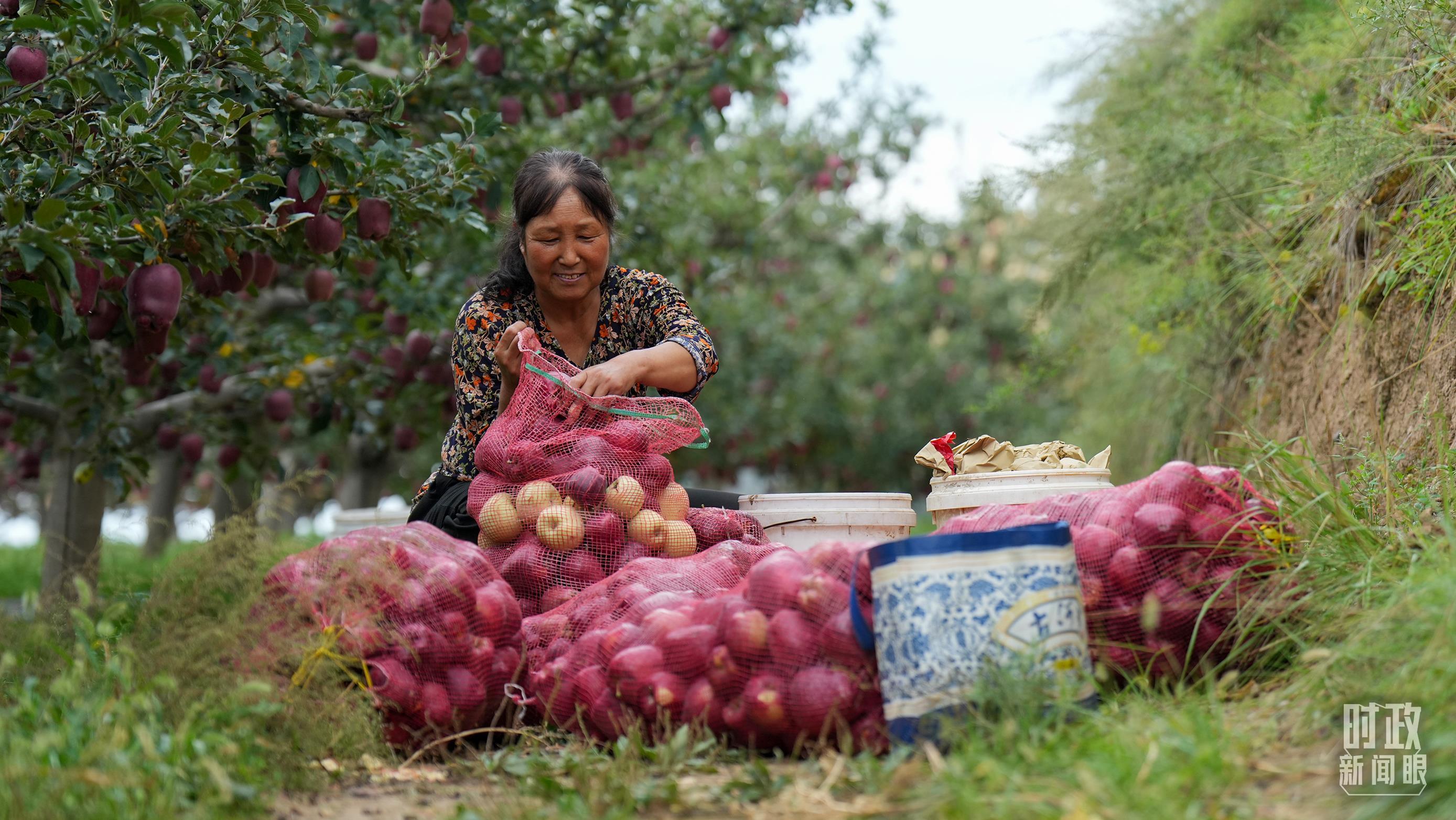 △甘肃天水市南山花牛苹果基地带动当地村民实现增收。(总台记者李晋拍摄)