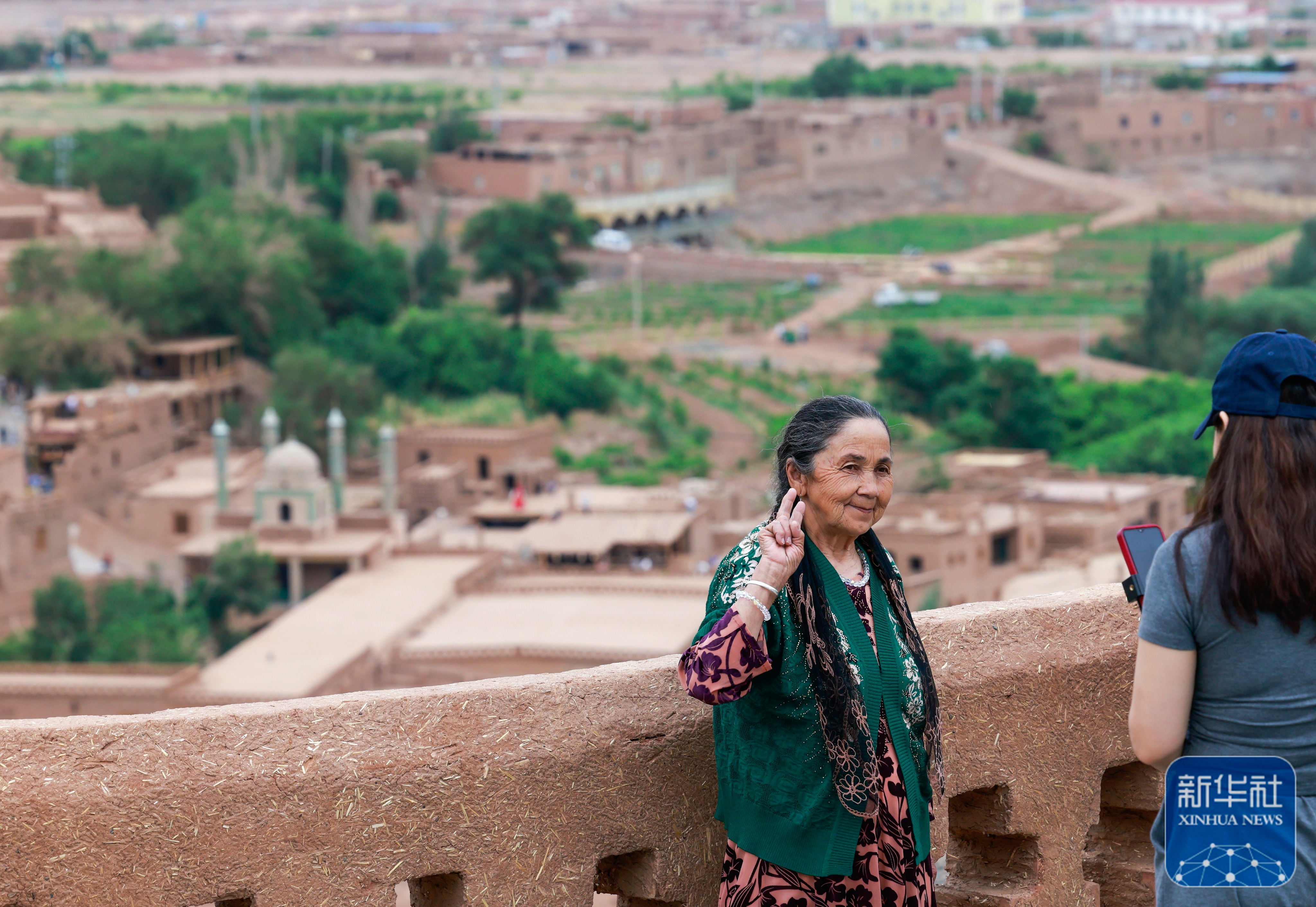 ↑ 5月4日,游客在新疆吐鲁番市鄯善县吐峪沟景区附近的观景平台拍照留影。新华社记者 王菲 摄影报道