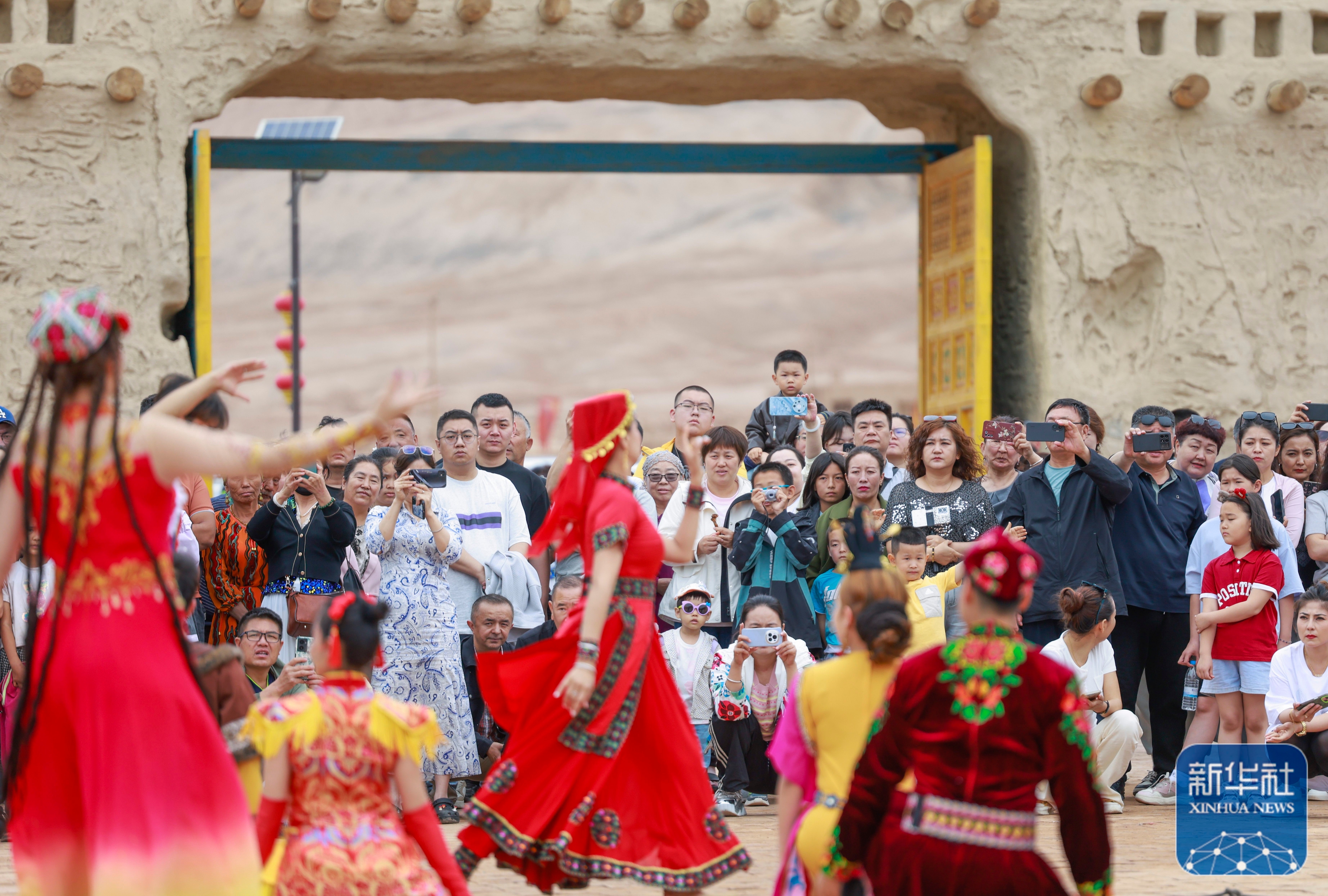 ↑ 5月4日,游客在新疆吐鲁番市鄯善县吐峪沟景区欣赏民族歌舞表演。