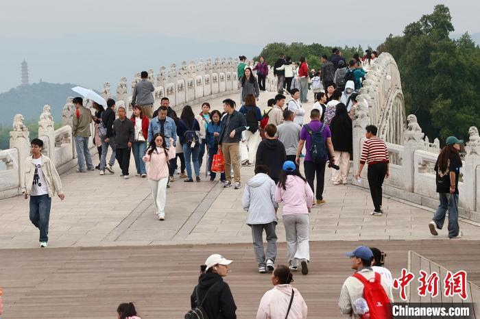 5月5日,民众在北京颐和园十七孔桥参观。 中新社记者 易海菲 摄