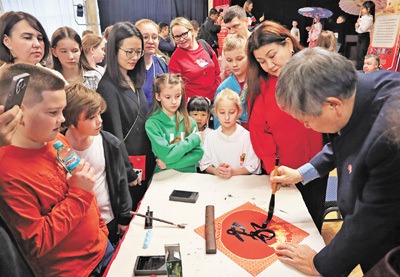 2月,俄罗斯中小学师生在莫斯科观看中国书法展示。人民日报记者 于宏建 摄