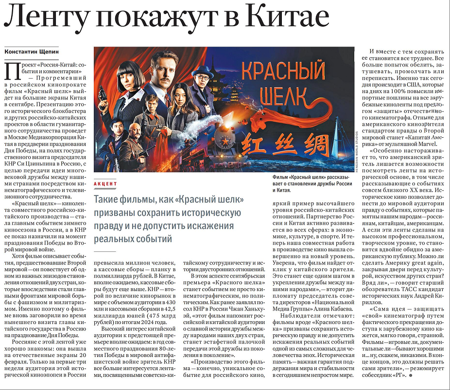 中俄合拍影片《红丝绸》是俄罗斯冬季档最受瞩目的影片。而该片在中国将于今年9月隆重纪念中国人民抗日战争暨世界反法西斯战争胜利80周年之际上映。