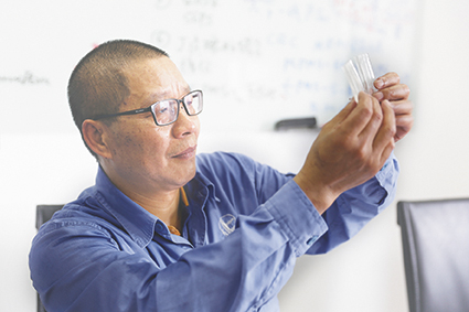 梁红文在实验室对比样品。