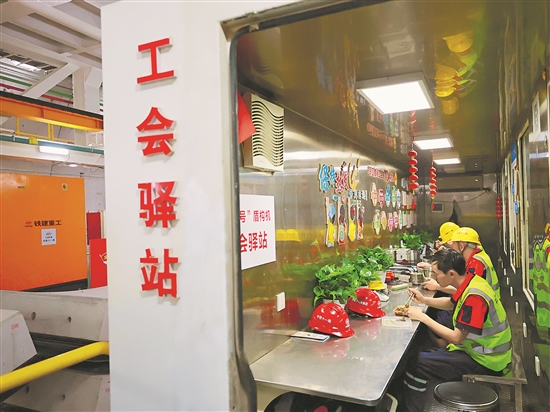 该驿站创新采用“盾构机嵌入式”设计,把15平方米的工会驿站模块化集成于盾构机中段舱室,随盾构机掘进整体移动,满足隧道建设者的“就餐、休息、喝水、充电”等需求。
