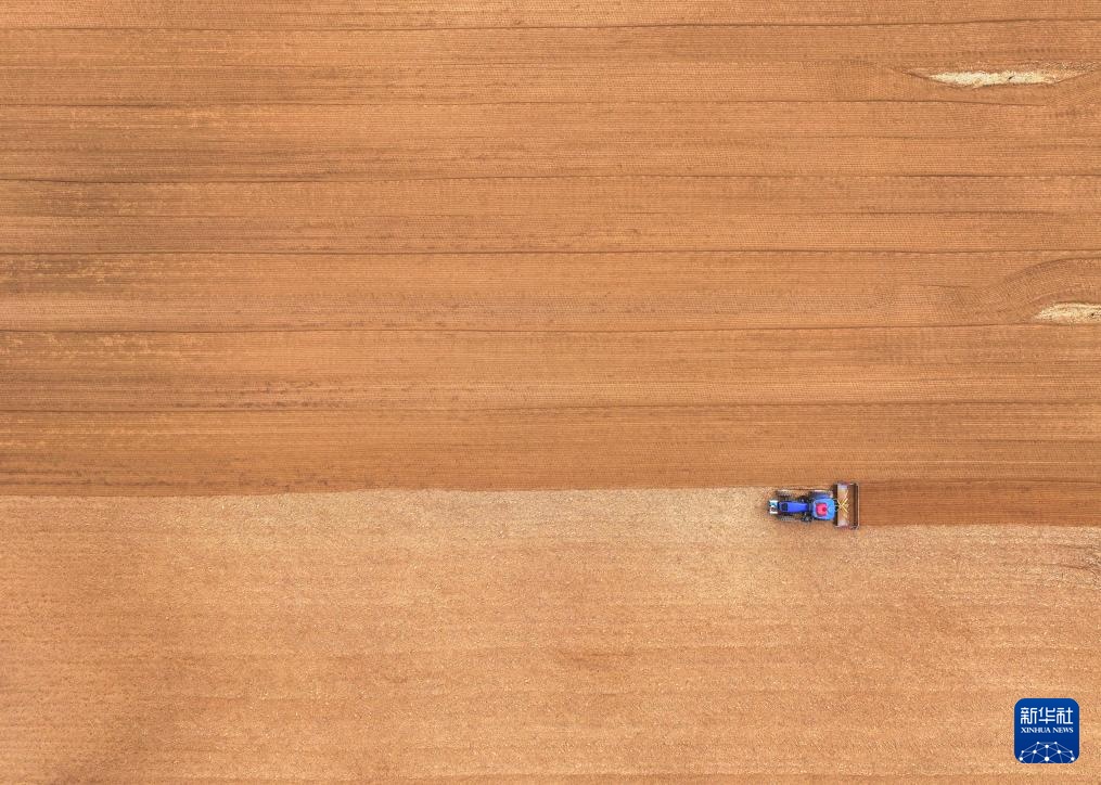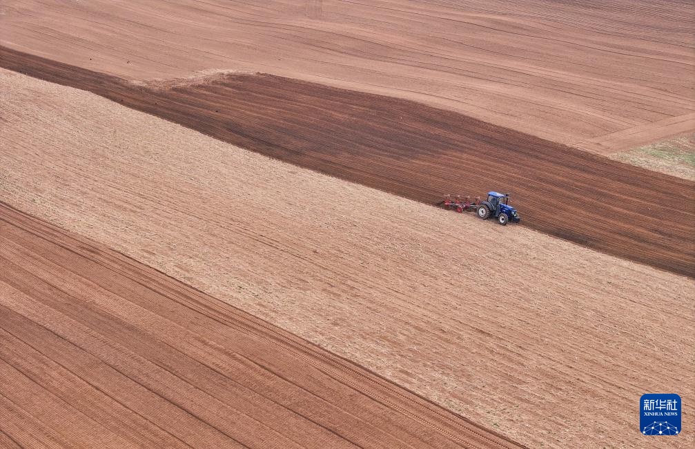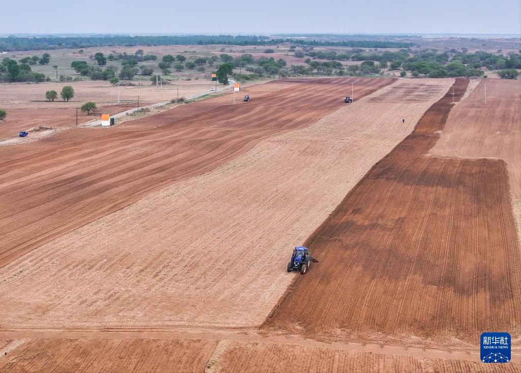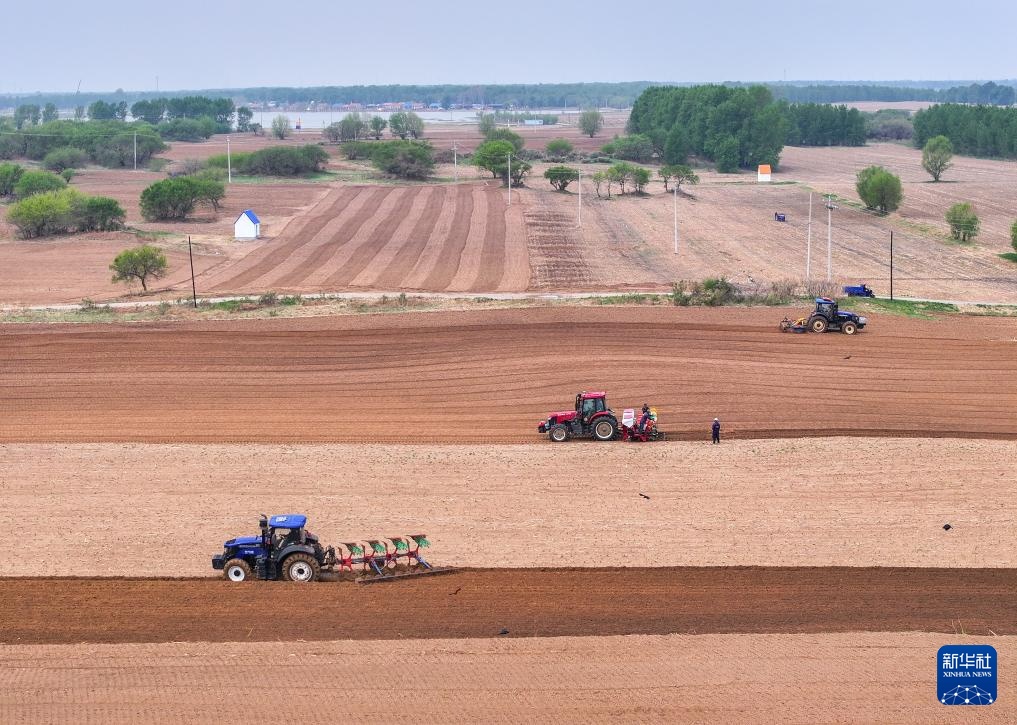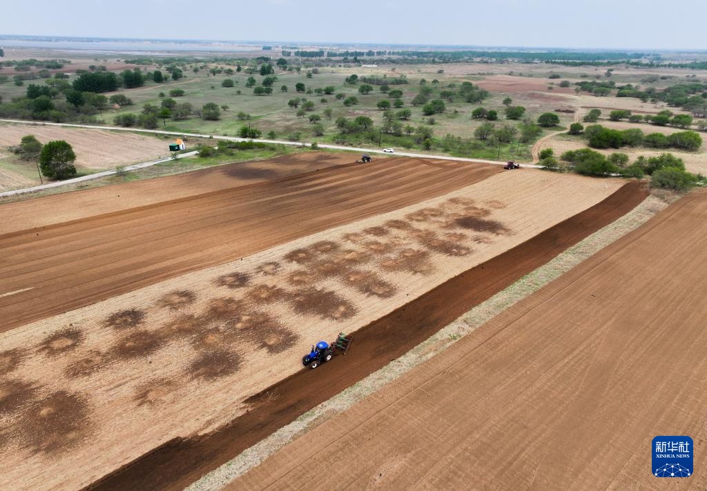 5月9日,在内蒙古通辽市科尔沁左翼后旗巴胡塔苏木伊和布拉格嘎查,农民驾驶北斗导航的拖拉机翻地(无人机照片)。新华社记者 连振 摄