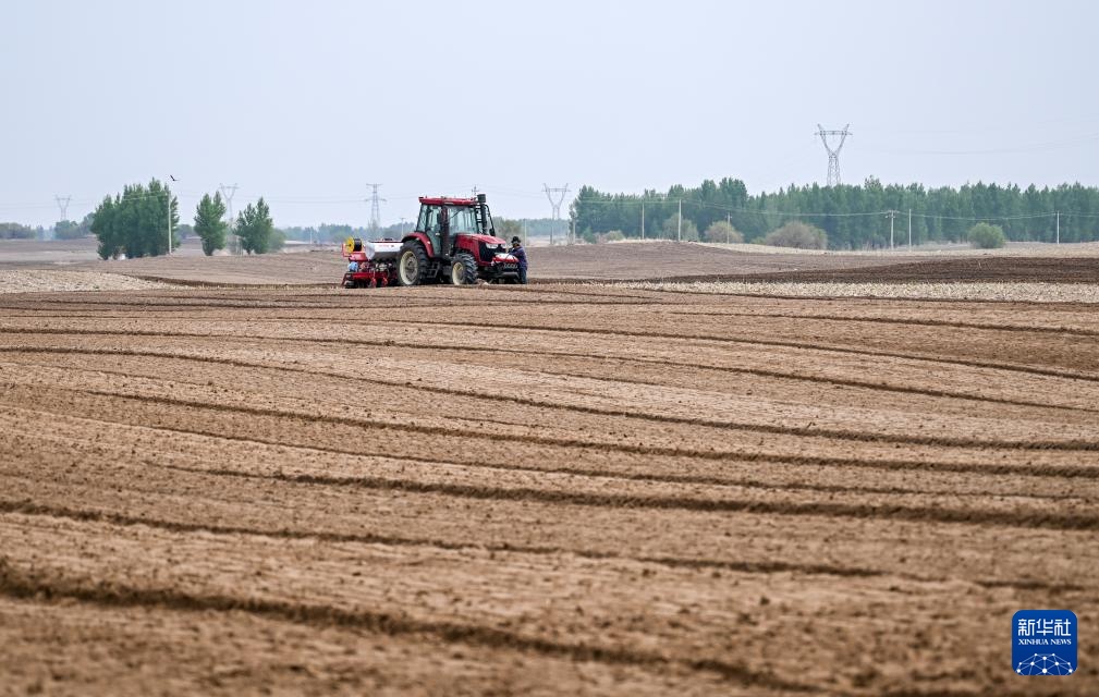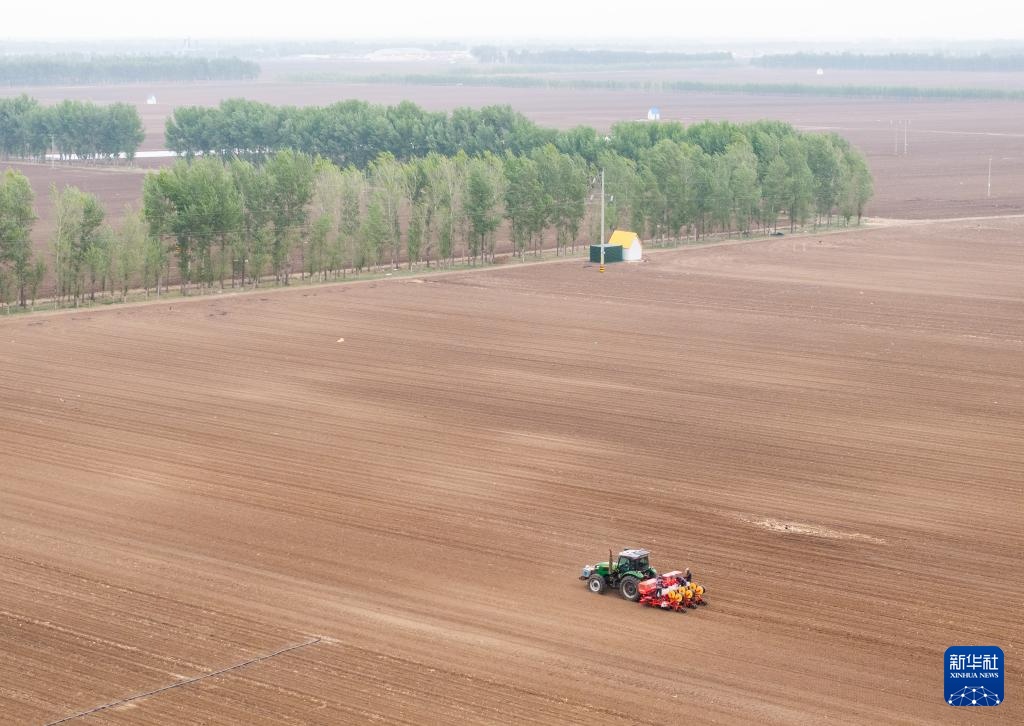 5月9日,在内蒙古通辽市科尔沁左翼后旗巴胡塔苏木伊和布拉格嘎查,农民驾驶北斗导航的拖拉机播种。新华社记者 连振 摄