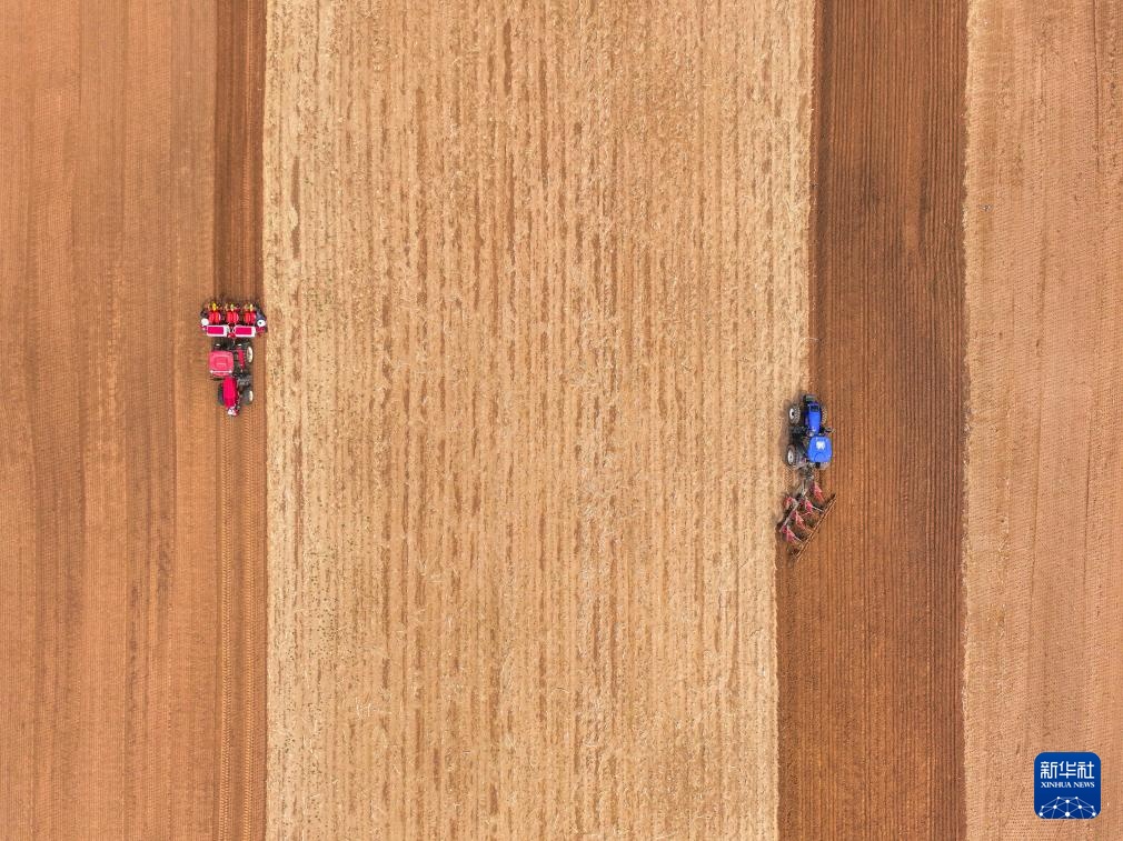 5月9日,在内蒙古通辽市科尔沁左翼后旗巴胡塔苏木伊和布拉格嘎查,农民驾驶北斗导航的拖拉机在田间耕作(无人机照片)。新华社记者 连振 摄