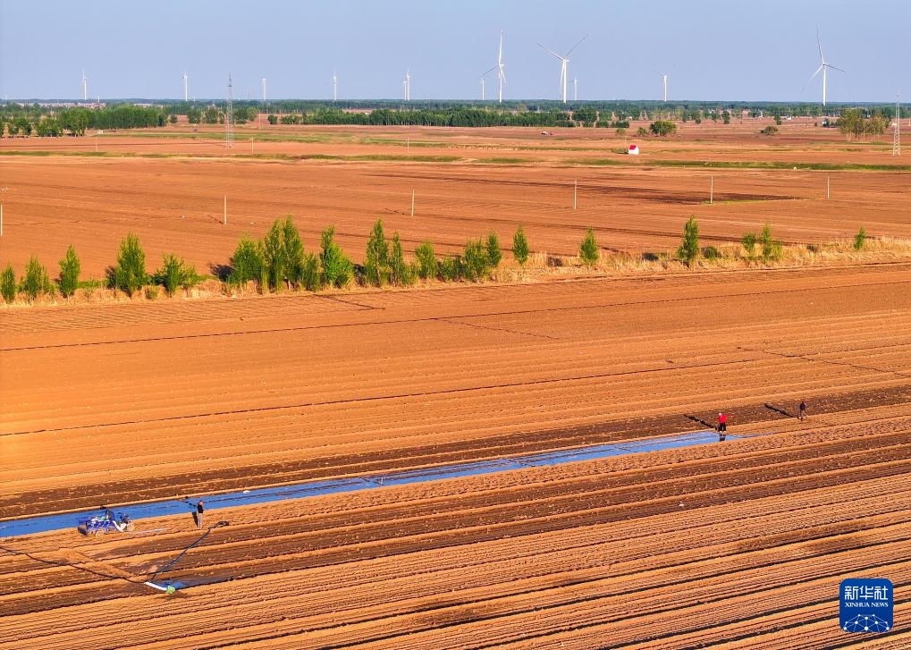 5月10日,在内蒙古通辽市科尔沁区钱家店镇坤都花村,人们在已经完成播种的良田上整理滴灌带(无人机照片)。新华社记者 连振 摄