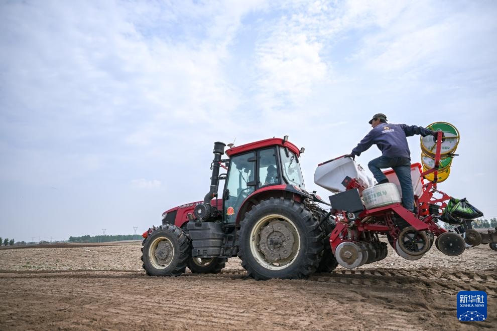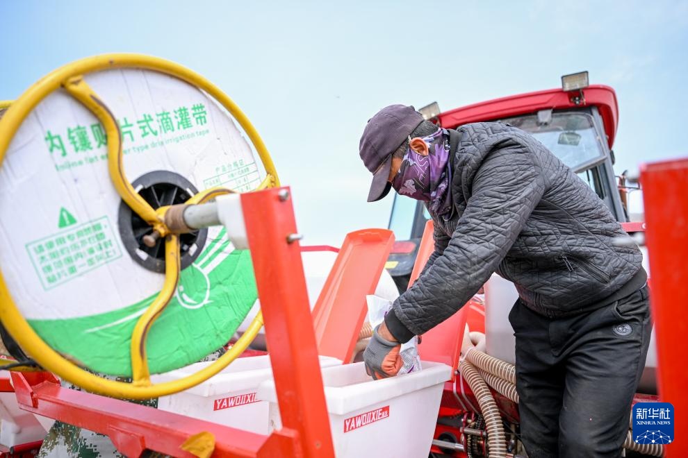 5月9日,在内蒙古通辽市科尔沁左翼后旗巴胡塔苏木伊和布拉格嘎查,农民往农机中装入种子。新华社记者 连振 摄